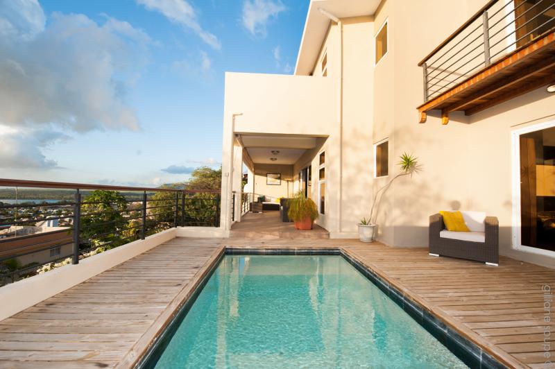 Our villa is a luxurious 3 storey villa/apartment located on the West Coast of the island near the top of the beautiful Black River Mountain. It boasts a breathtaking panoramic view of Black River and Le Morne coasts, with amazing sunsets over the ocean.