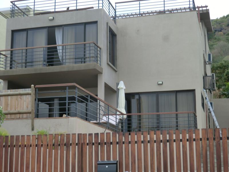 Duplex of four bedrooms, with one en suite, in a gated comunity, newly built, fully furnished and equipped, 195 square meters. American kitchen with living area opening on wooden deck with pool and small garden. Nice view on Le Morne Mountain and Black River Bay.