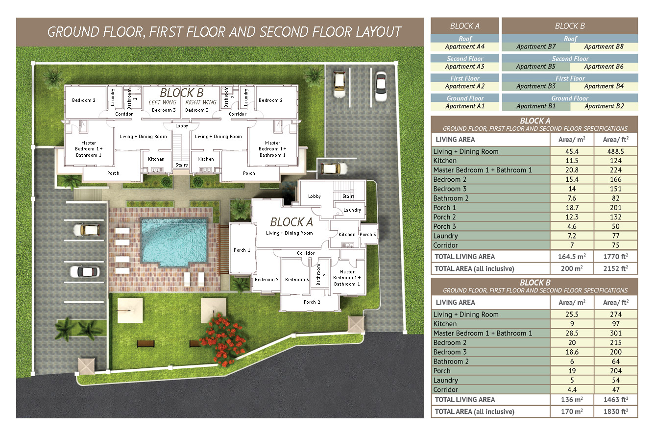 Blok A features 2 apartments has 3 x 200m2 ( Ground floor still available), second floor has its own roof to terrace of 155m2