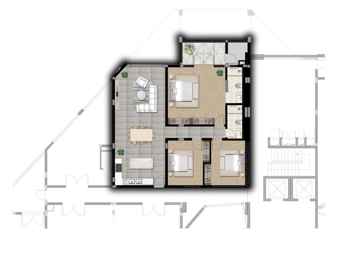 This nicely furnished apartment of 142.4 m² is on the second floor with lift. The apartment has a master suite, 2 bedrooms, a shared bathroom, a living room, a dining room and a kitchen. It has a covered balcony. There is private covered parking. Accessible to foreigners.