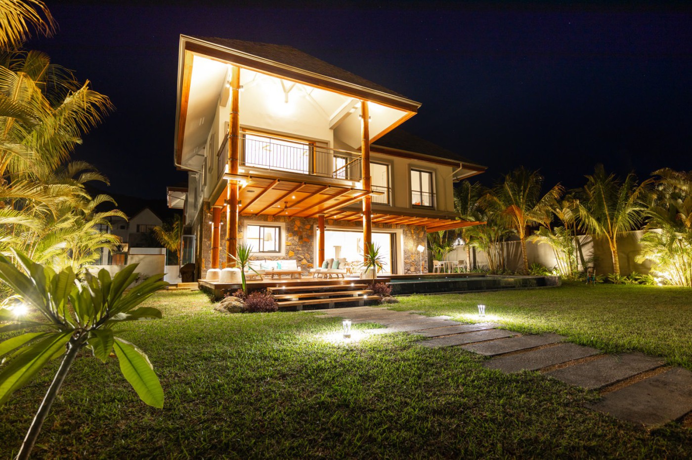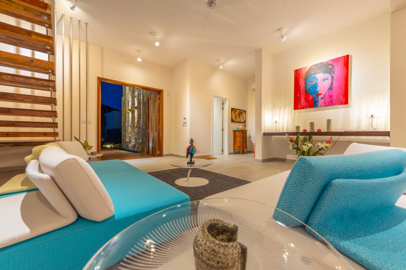 The 545m2 villa sits on 1154m2 of land. The entrance has a salt water cascade pond and high walls.
