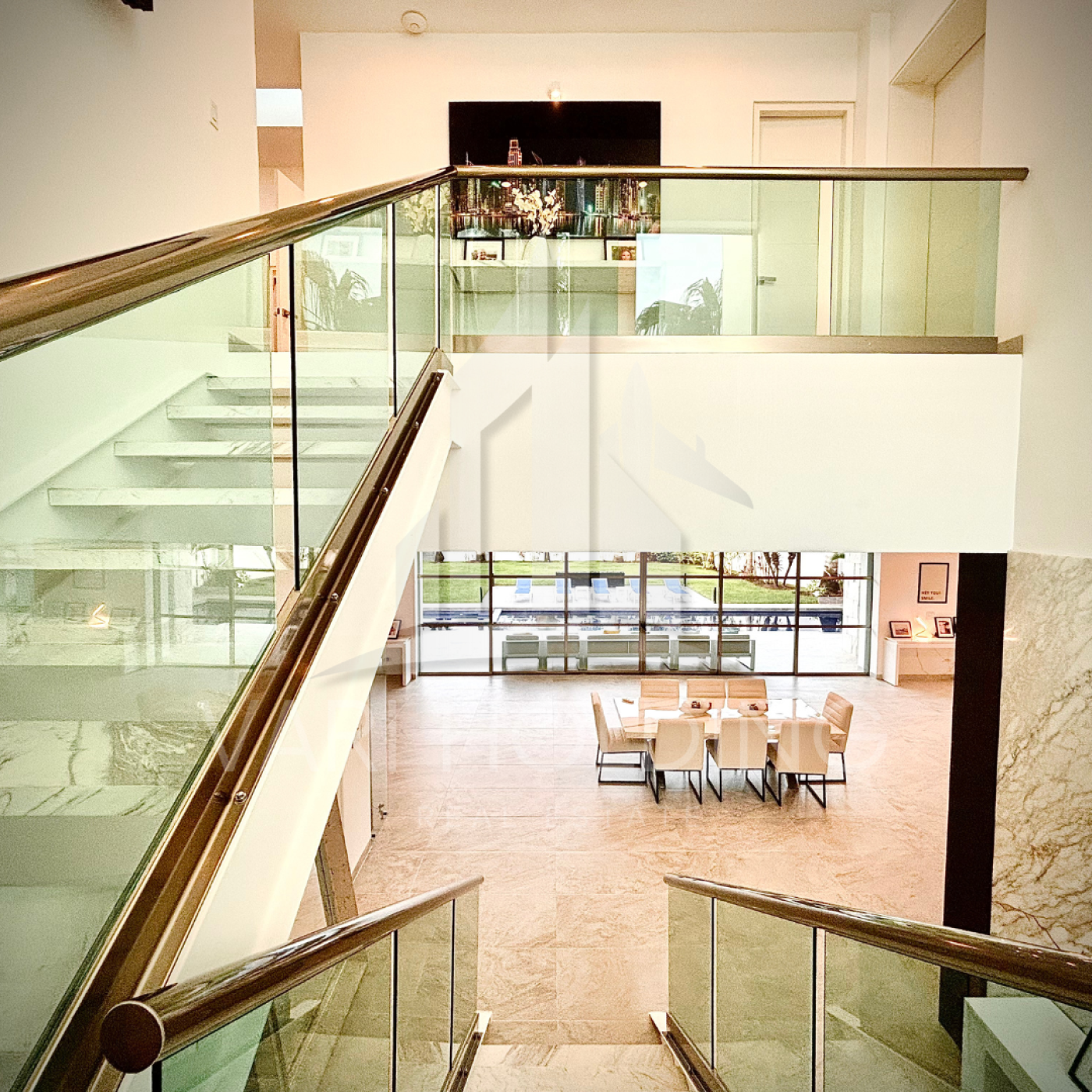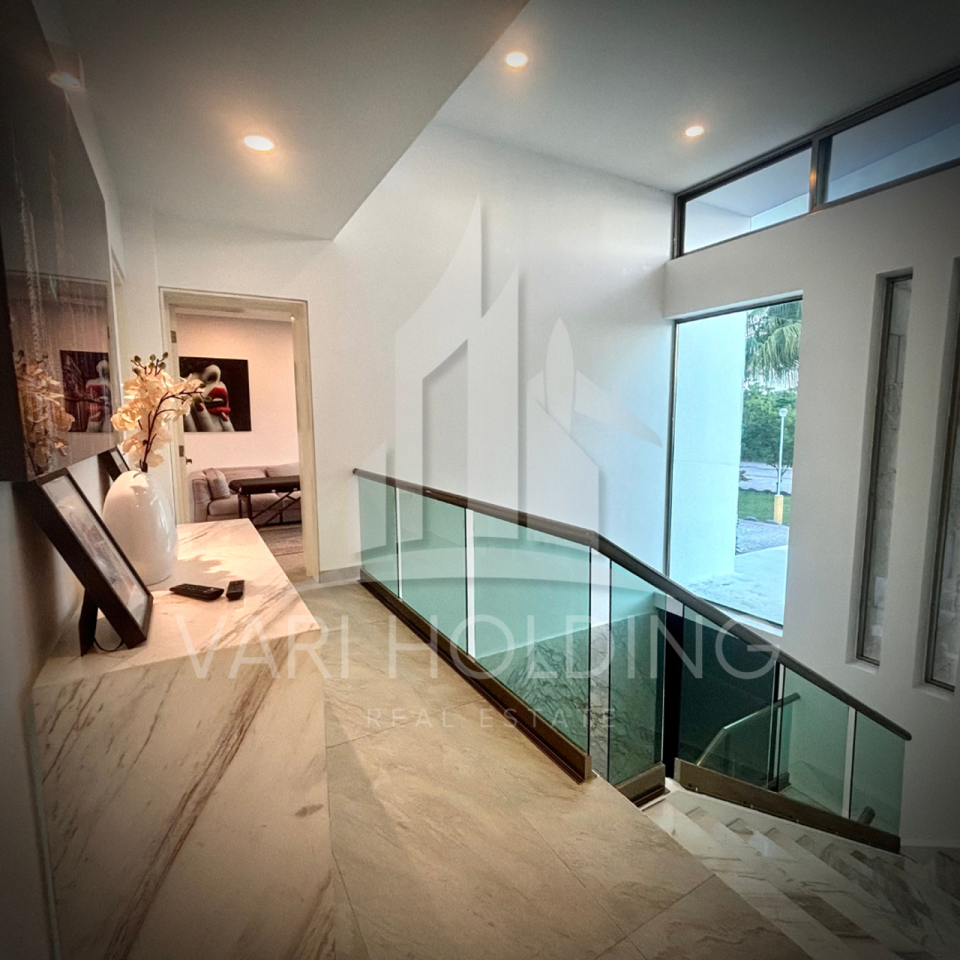 Upon entering the grand foyer, you are welcomed by a double-height ceiling and marble finishes,