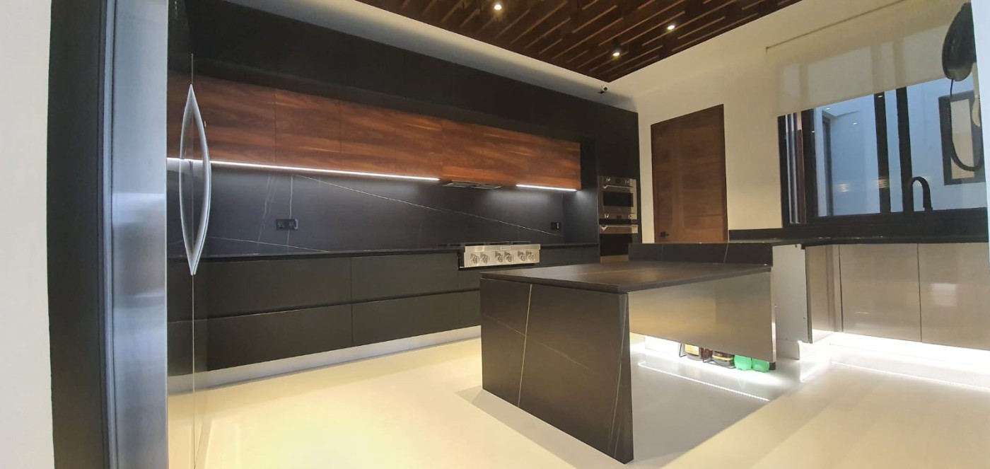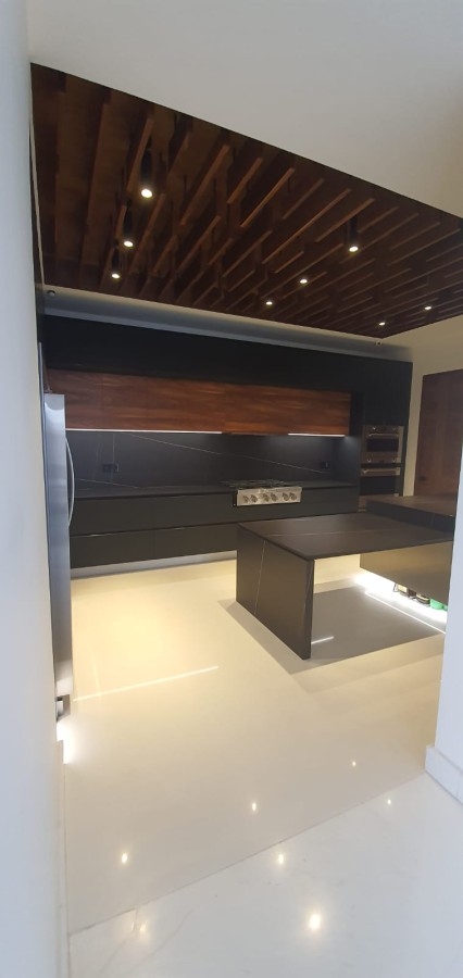 Acabados de lujo como mármol, granito, cuarzo, corian, madera de ingeniería, diseños en plafones de