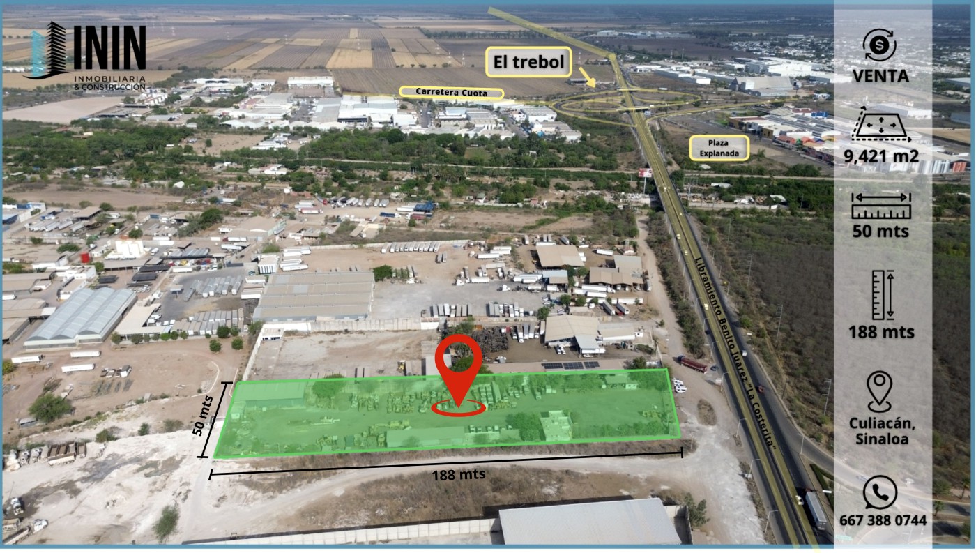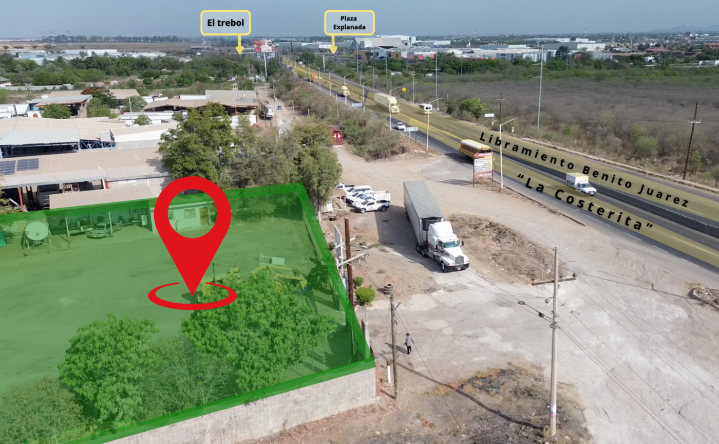 This 9,421 m² industrial lot in southern Culiacán, Sinaloa, Mexico, is for sale at MXN 2,800,000. Strategically located on Libramiento Benito Juárez (La Costerita), just 800 meters from the highway interchange and toll road, it offers excellent access and infrastructure for logistics or industrial development.
