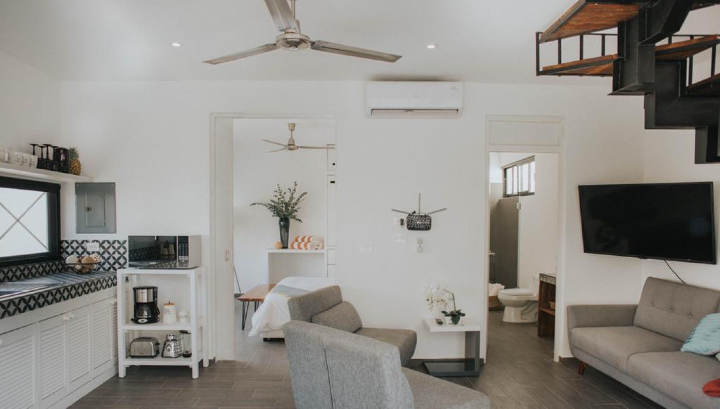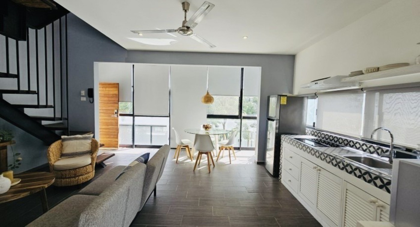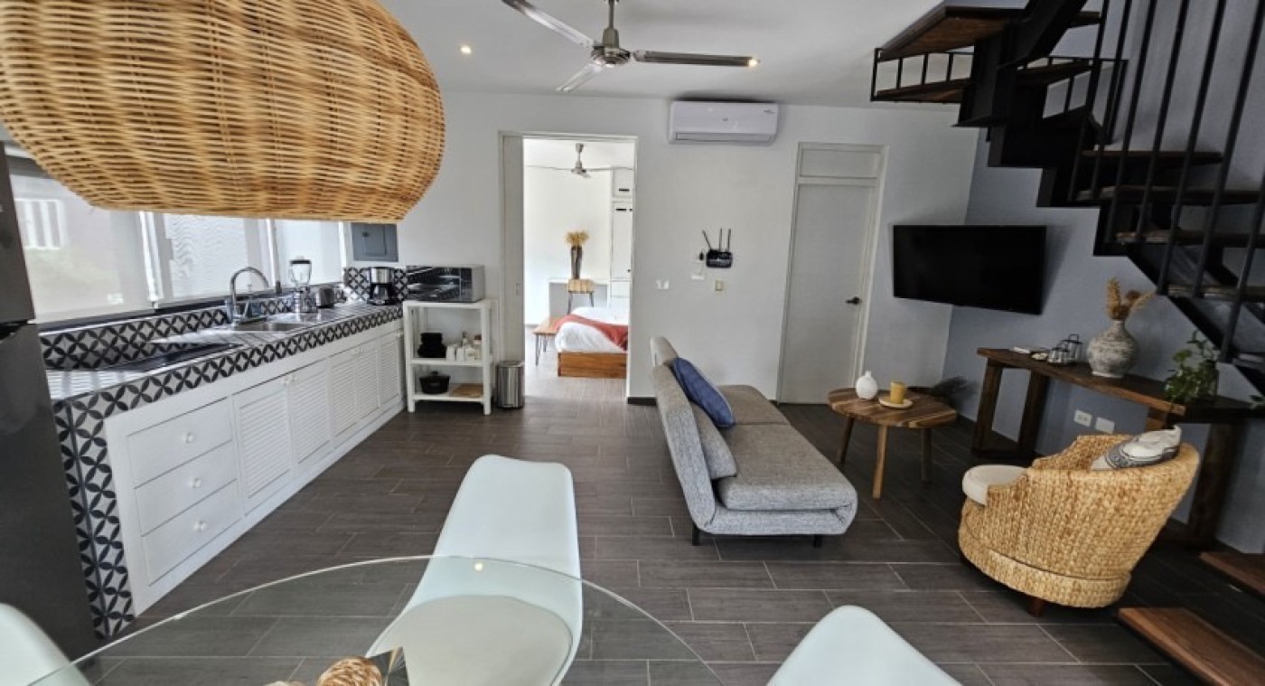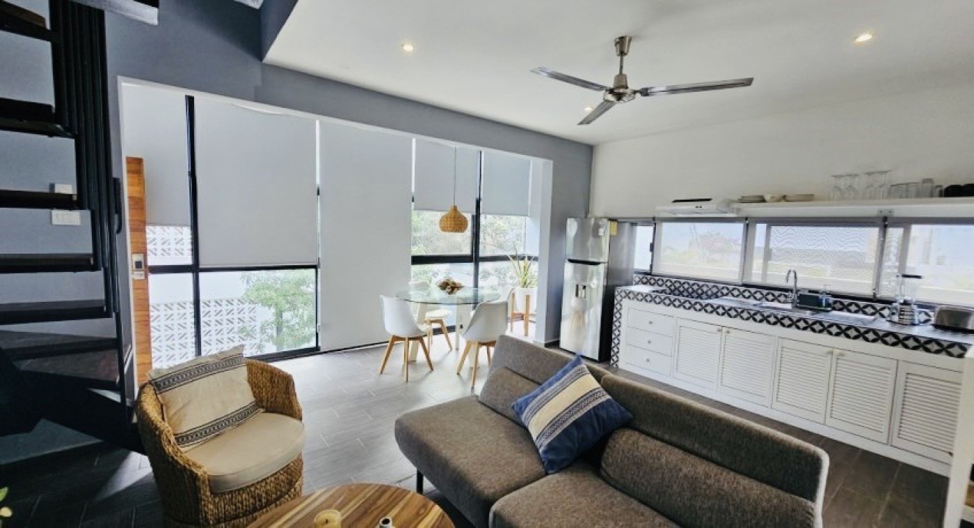 This fully furnished penthouse in La Veleta, Tulum, Mexico, is for sale at MXN 4,250,000. With a private rooftop and pool, local wood furniture, and modern finishes, it offers a luxurious retreat just minutes from the beach and town centerâ€`ideal for personal use or as a vacation rental investment.