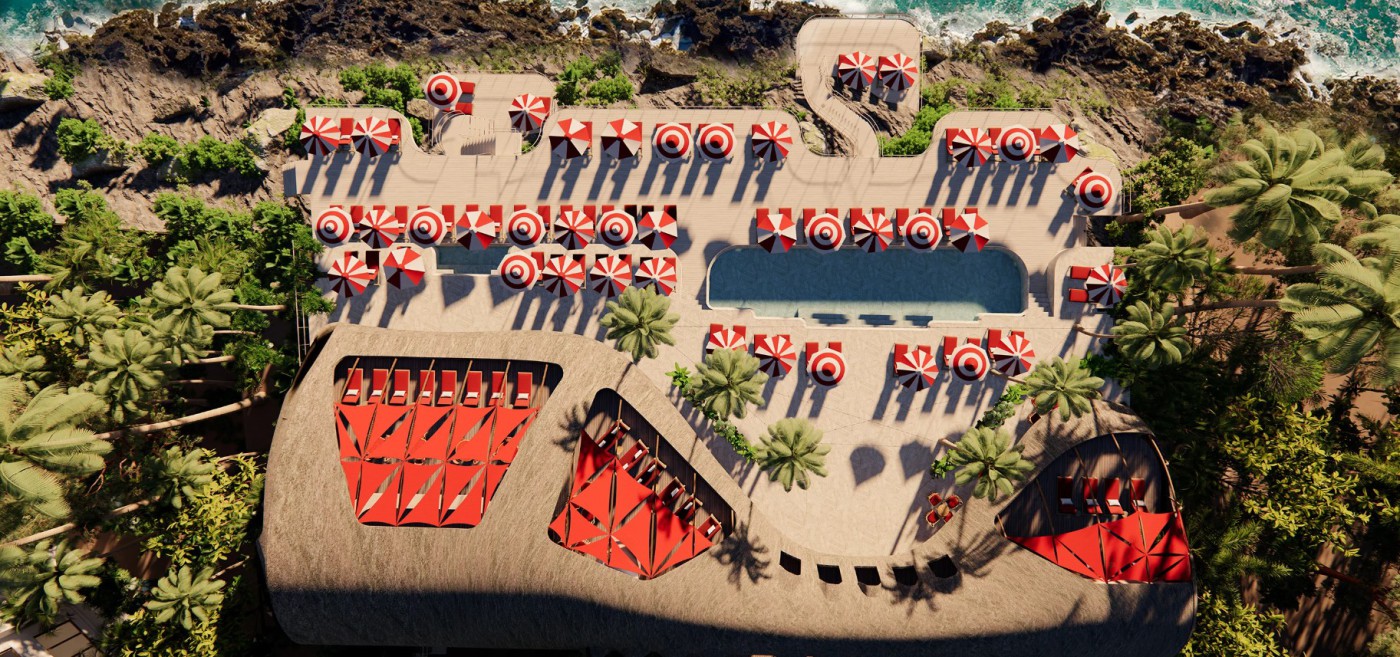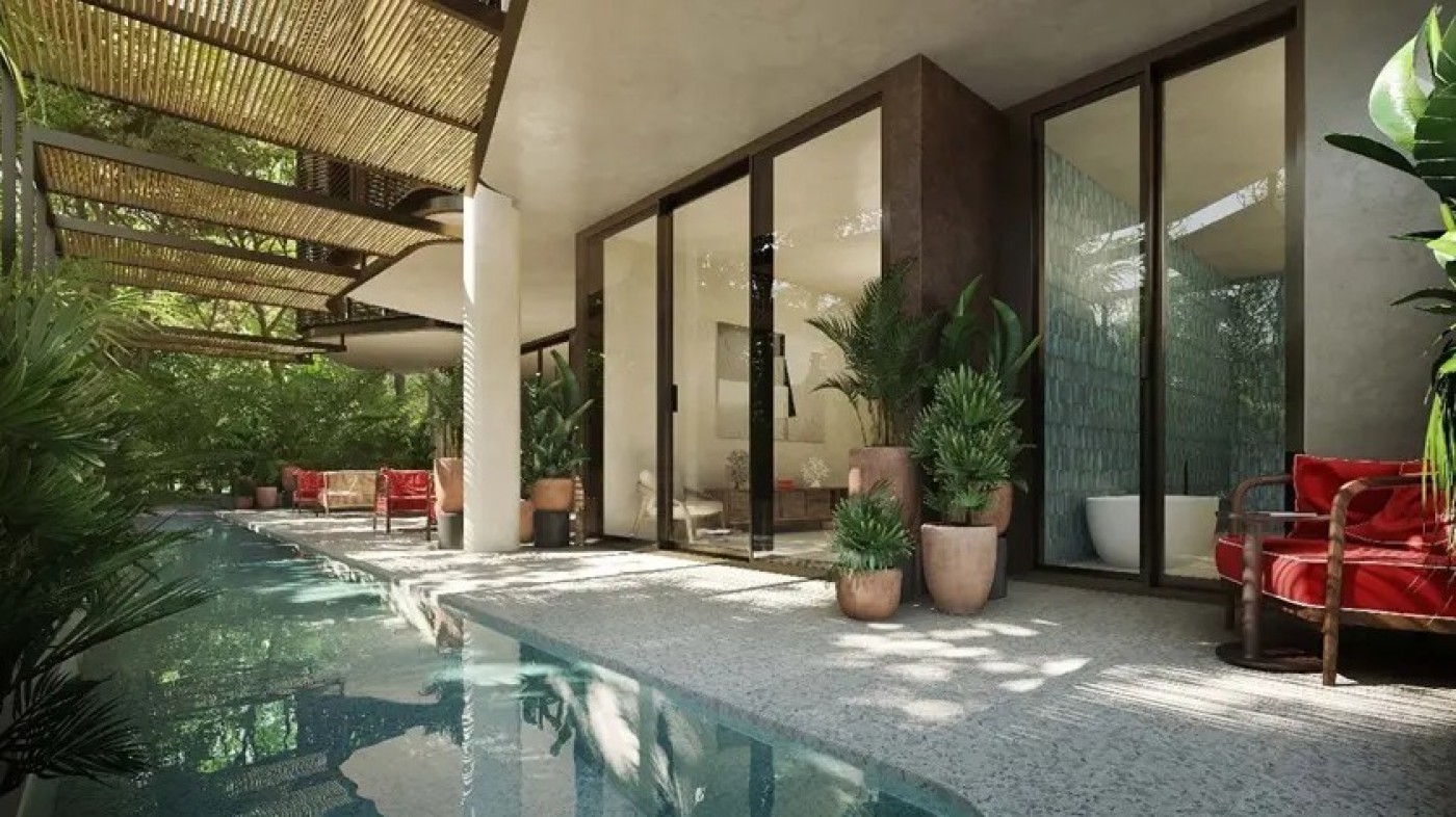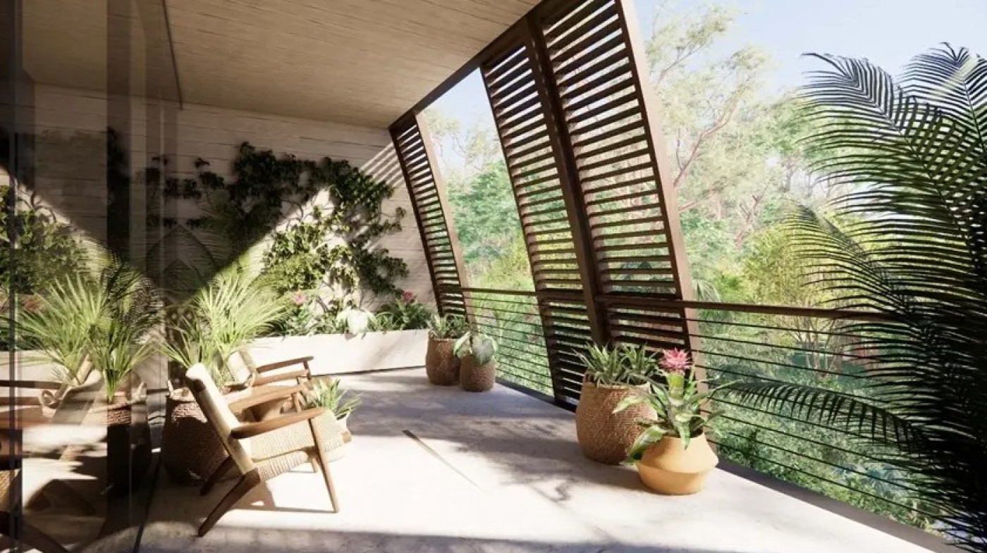 Inspired by Mayan heritage and nature’s raw beauty, the design integrates natural textures-chukum, raw concrete, and warm wood-seamlessly merging architecture with the jungle.