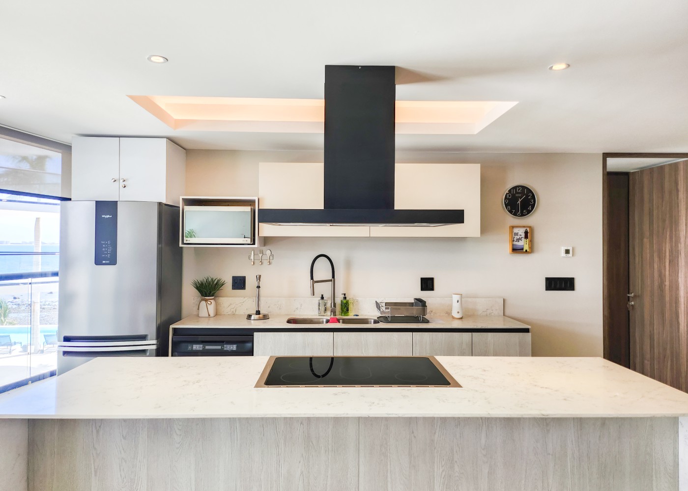 conectándose de manera fluida con la sala-comedor, que invita a disfrutar momentos en familia o con amigos.