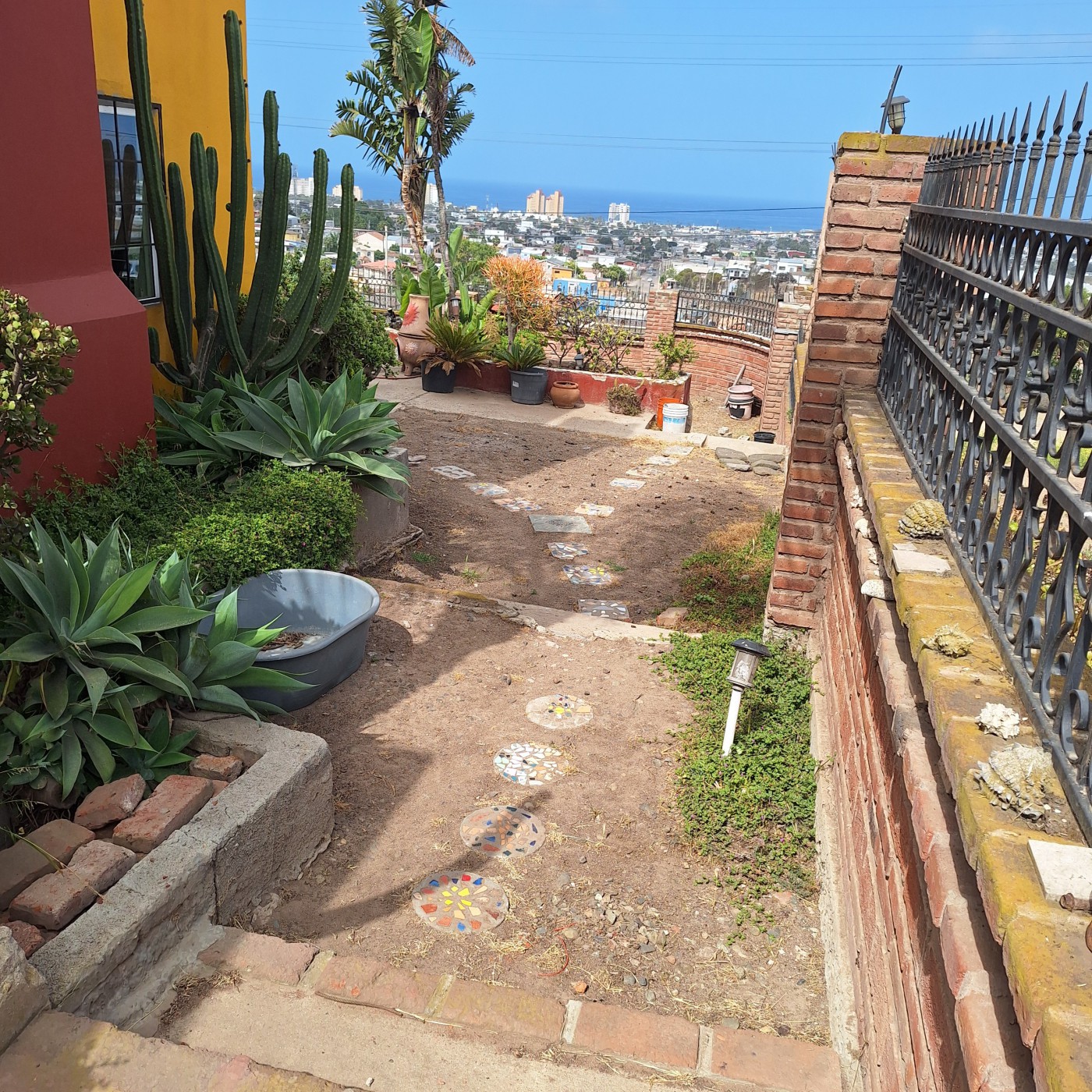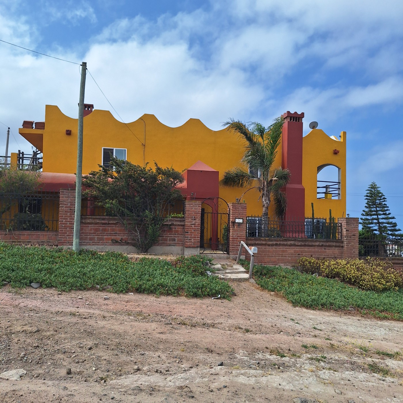 Four bedrooms, two full baths, two corner lots, split-level yard, landscaped grounds with a rooftop deck offering views of Rosarito, all-brick and wood interior, three fireplaces, and a two-car garage.