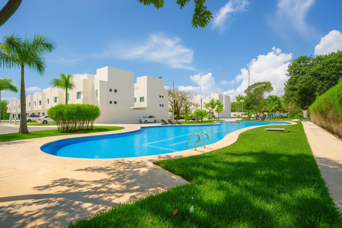 Community amenities include three swimming pools, tropical gardens, 24/7 security, a children s playground, pet-friendly policies, and included parking. The property is a 15-minute walk to Playa Esmeralda and a 5-minute drive to the Soriana supermarket.