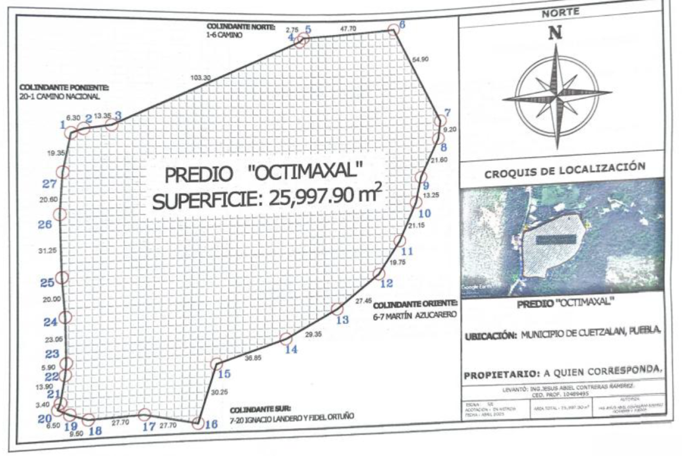 With a minimum purchase of 200 m2 at MXN 1,000-1,300 per m2 (negotiable based on area), the property is located roadside at Kilometer 4 of the Cuetzalan-Rayon highway. It is equipped with electricity and potable water and is a 15-minute drive from both the center of Cuetzalan del Progreso and the Yohualichan archaeological site.