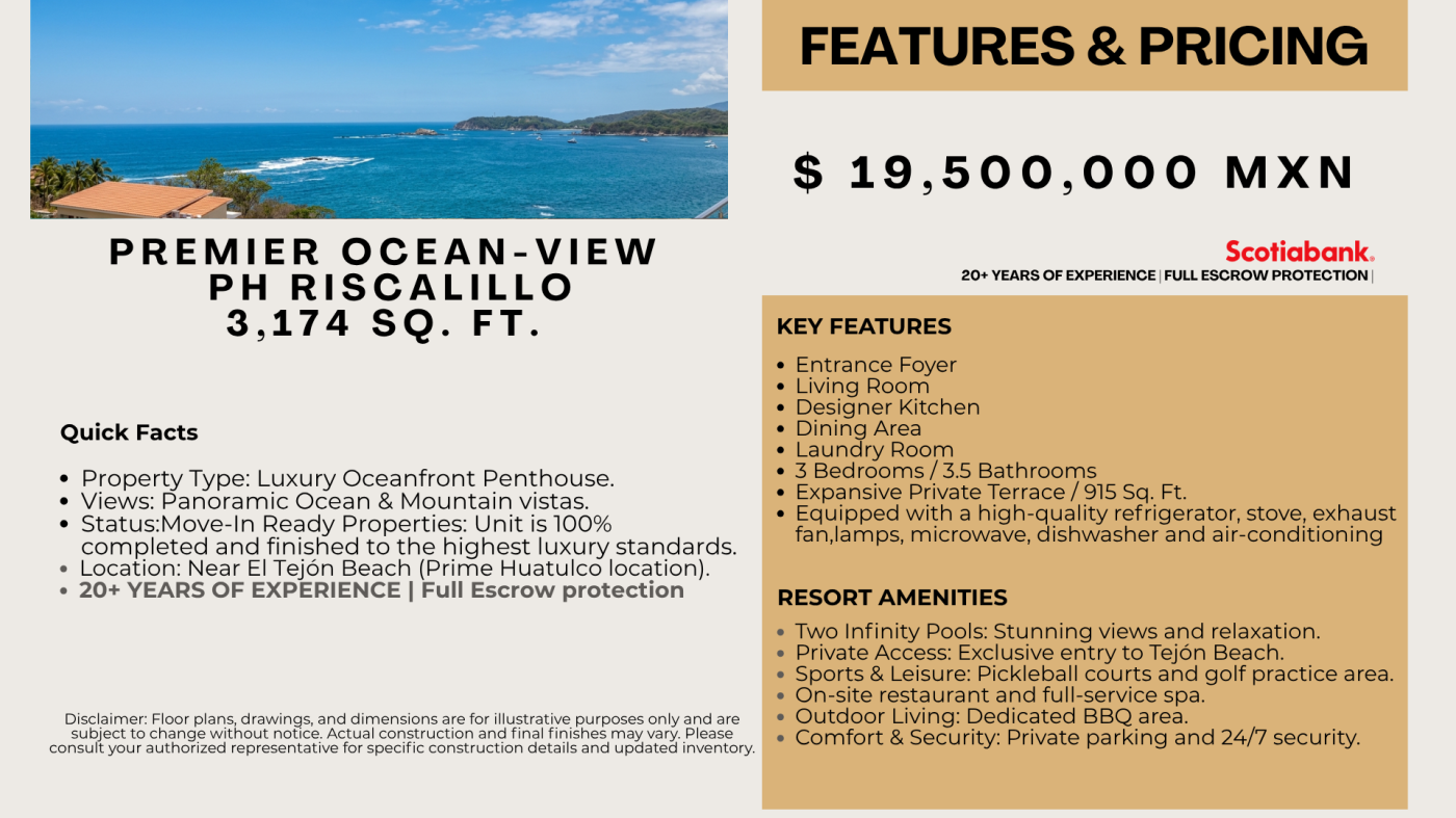 Indulge in unparalleled luxury at this move-in ready penthouse on El Tejon Beach in Huatulco, Oaxaca. This 3,174 sq ft interior space with a 915 sq ft terrace offers panoramic ocean and mountain views, a grand foyer, open living and dining area, chef`s kitchen with premium appliances, laundry room, three bedrooms, and three and a half bathrooms.