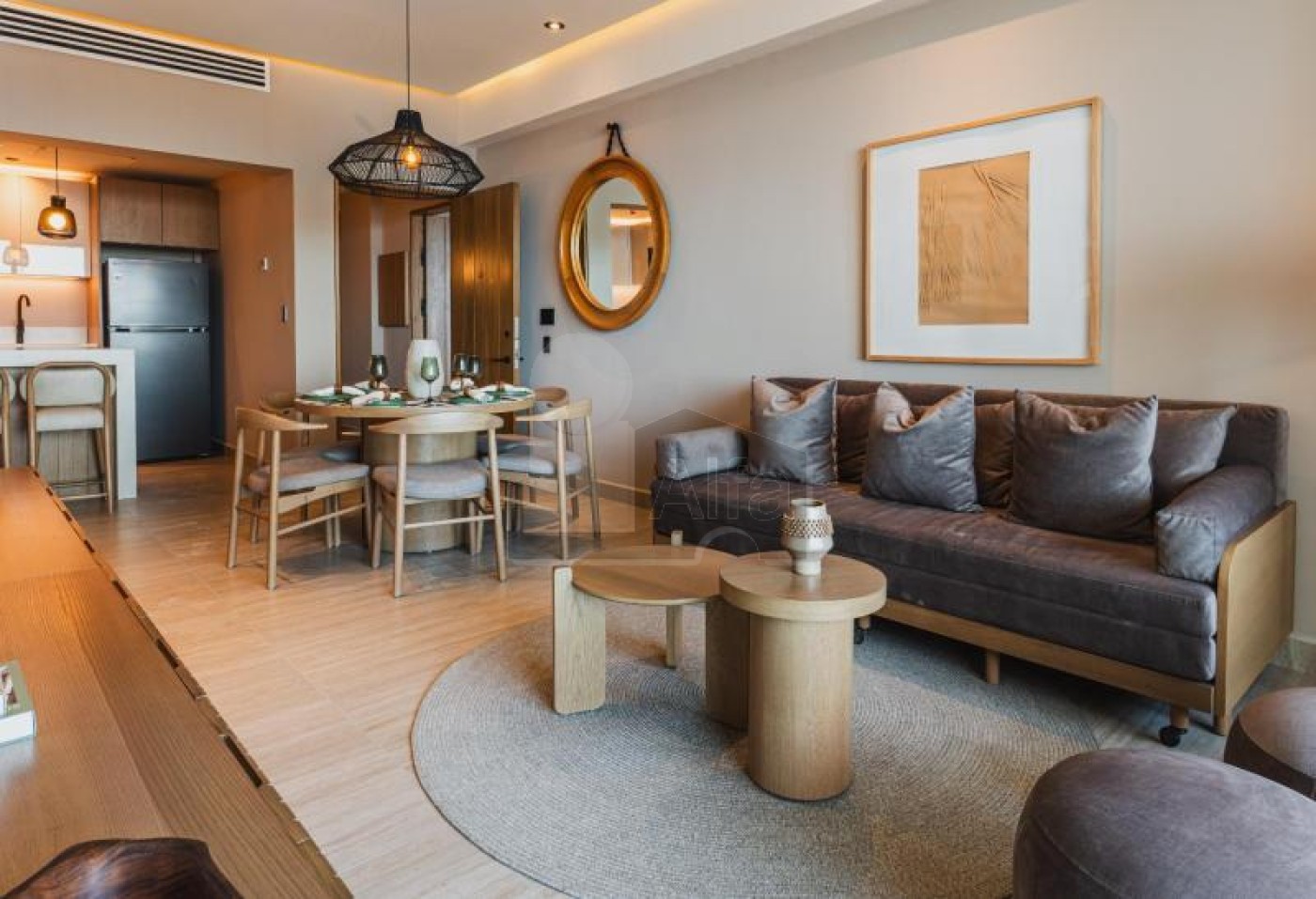 Chic one-bedroom, garden-level condominium at INNA Beach Condos & Hotel in Puerto Morelos, near Canc`un. This modern, open-plan residence spans 110.94 m^2 (1,220 sq ft) and offers seamless indoor-outdoor living with a private garden terrace. Delivery is scheduled for the end of summer 2026. This is full ownership rather than a timeshare or fractional property.