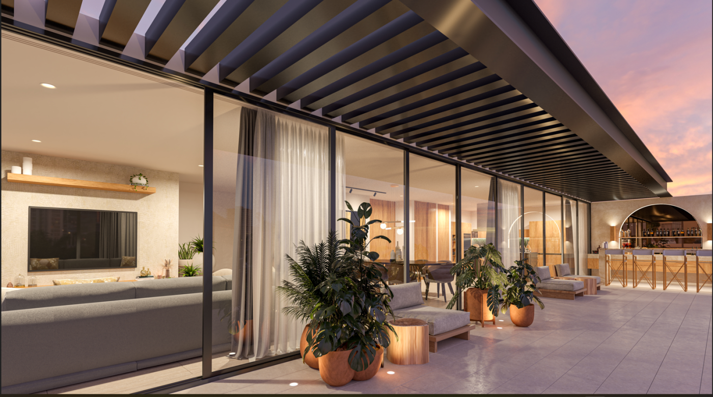 This exceptional development encompasses 15 levels and boasts a diverse array of units: 104 apartments, 6 penthouses, 8 office spaces, and 3 commercial areas. Located in Santa Gertrudis Copó, the complex offers over 25 luxurious amenities, including a sky-view yoga room, a rooftop bar, outdoor gym, swimming pool, and dry cleaning services.