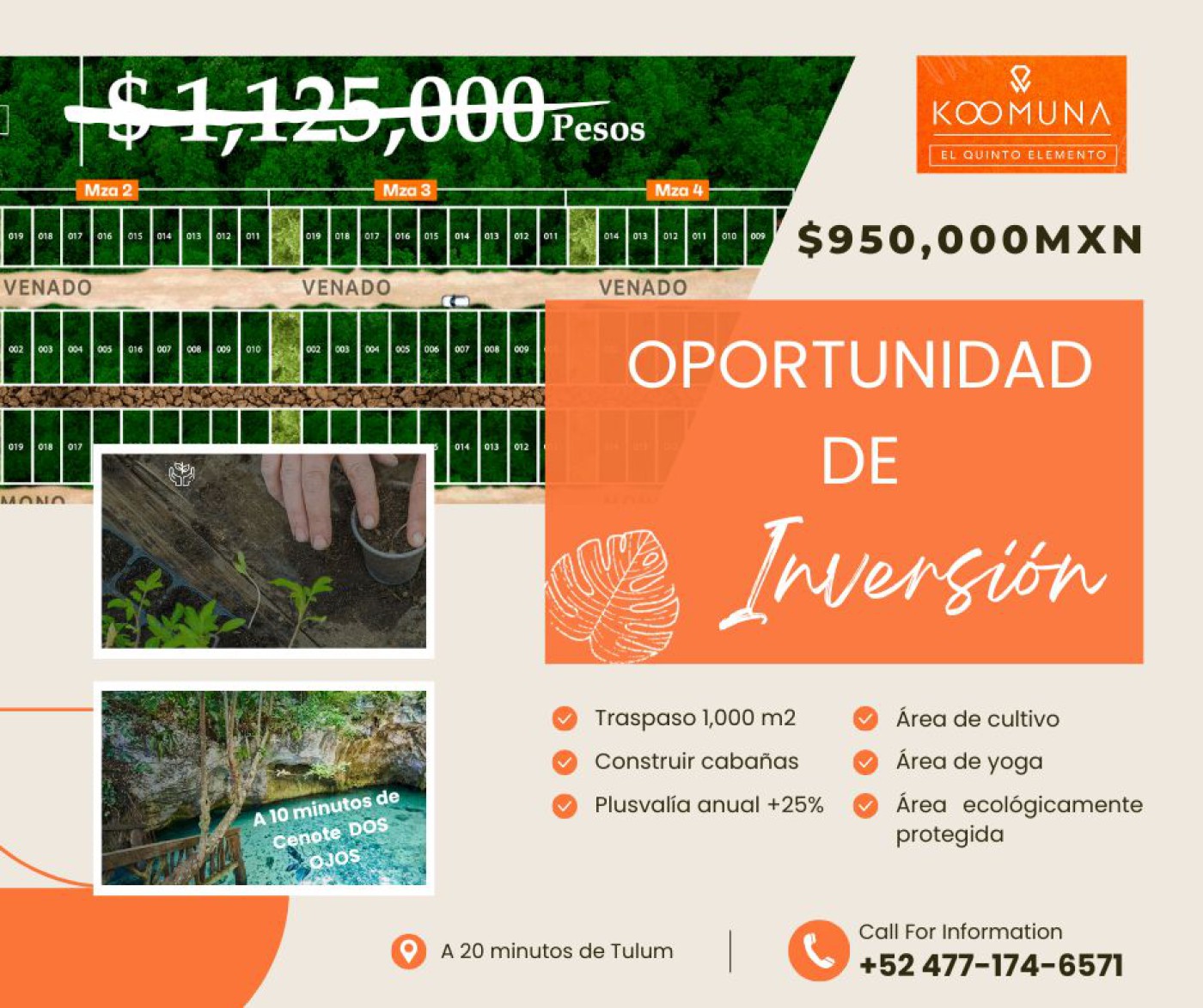 1,000 square m. (10,763.9 ft2) 15 min from Tulum and 10 min from Cenote Dos Ojos Ideal for building a Cabin Ecologically Protected Area Annual Capital GAIN MORE than 25% In Koomuna Development Yoga Area Cultivation Area