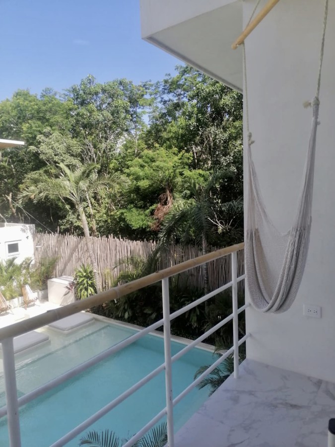 Brand new beautiful Studio, fully furnished and equipped to stay in or to put up for rent inmediately. Only a few blocks from Kukulkan avenue, the second most important avenue in town and a 5 minute ride to the beach or down town. On 15 Zone (zona 15), a highly and fast developing zone in Tulum, very well locate just between the beach and the down town area. Great facilities, 2 swimming pools( one per buliding), restaurant, gym and yoga area, concierge service, private and secure.