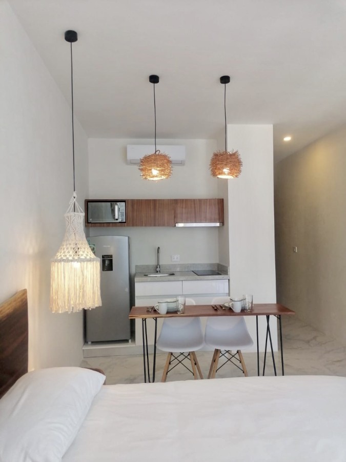 Hermoso estudio totalmente amueblado y equipado para usar o poner en renta de inmediato. A solo unos pasos de la avenida Kukulcán y a 5 minutos de la playa o del centro de Tulum, en bici . En la Zona 15 una zona de alto desarrollo y muy buena ubicación. Excelentes amenidades, 2 albercas( una por edificio), restaurante, gimnasio y area de yoga, Servicio de concierge . Privado y seguro