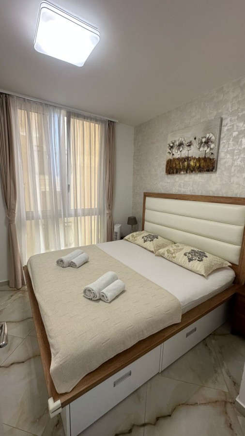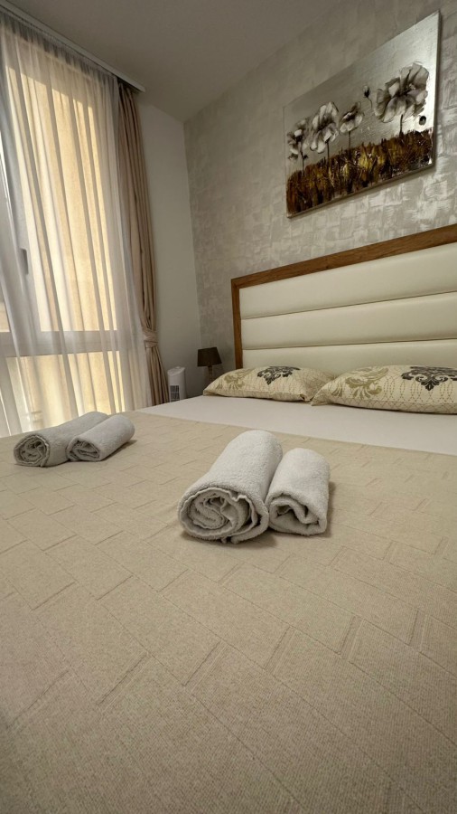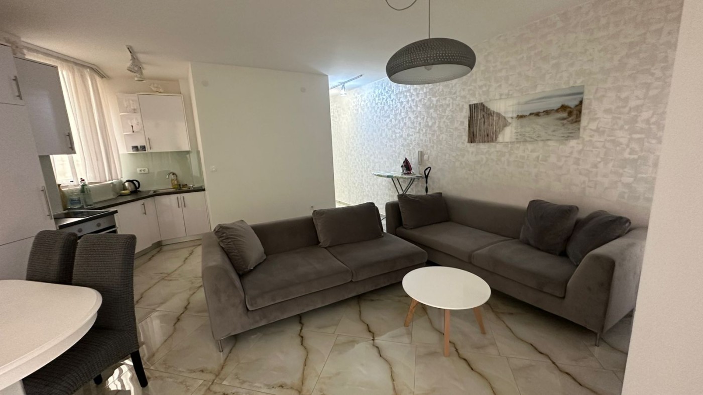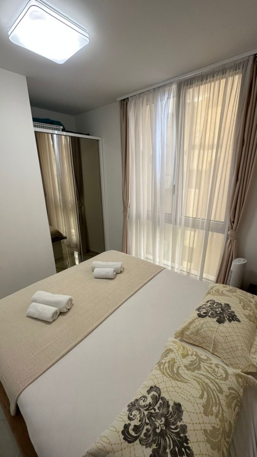 The apartment is fully furnished and equipped with modern appliances. The interior features a light color palette, which, combined with large windows, creates a spacious and comfortable living environment.