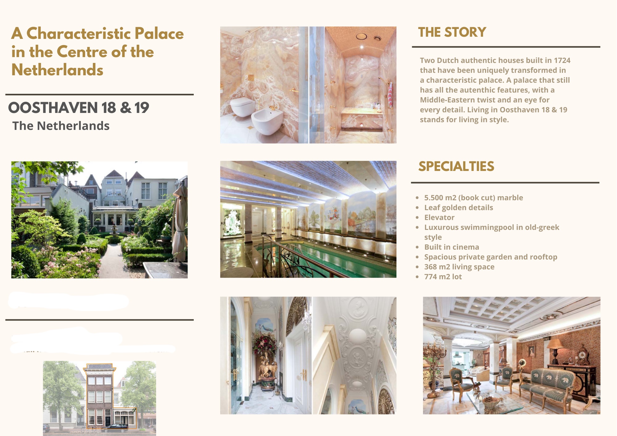 A Characteristic Palace in the Centre of the Netherlands Two Dutch authentic houses built in 1724 that have been uniquely transformed in a characteristic palace. A palace that still has all its authentic features, with a middle eastern twist and an eye for every detail. Living in this palace stands for living in style. Situated in a Dutch authentic city, Gouda. Closely located to all larger cities such as Amsterdam, Rotterdam, the Hague and Utrecht.