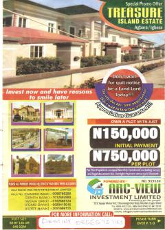 INSTANT ALLOCATION GUARANTEED! Acres Of Land in Treasure Island Estate, Agbara/Igbesa, #850,000 per plot, with 10% discount on outright payment,(#765,000) #150,000 initial payment, #35,000 monthly installment option(for two years). Title: Deed of Assignment, Deed of Contract, Survey, Global C of O.