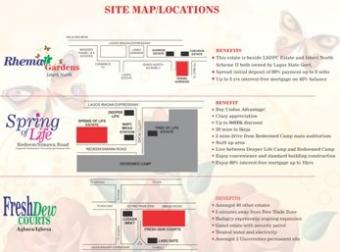 Spring of Life Estate (Opposite Redeemers University Permanent Site) is a well secured and gated estate situated in Simawa beside Redemption Camp (RCCG) and behind Deeper Life Ministries with a link road to Ikorodu and Shagamu.