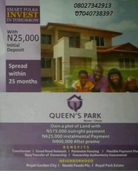 QUEEN`S PARK,Mowe-Ofada. 30minutes drive to Lagos State Secretariat. #575,000 Outright payment #625,000 instalmental payment nd Initial payment of #25,000 Spread within 25 Months.