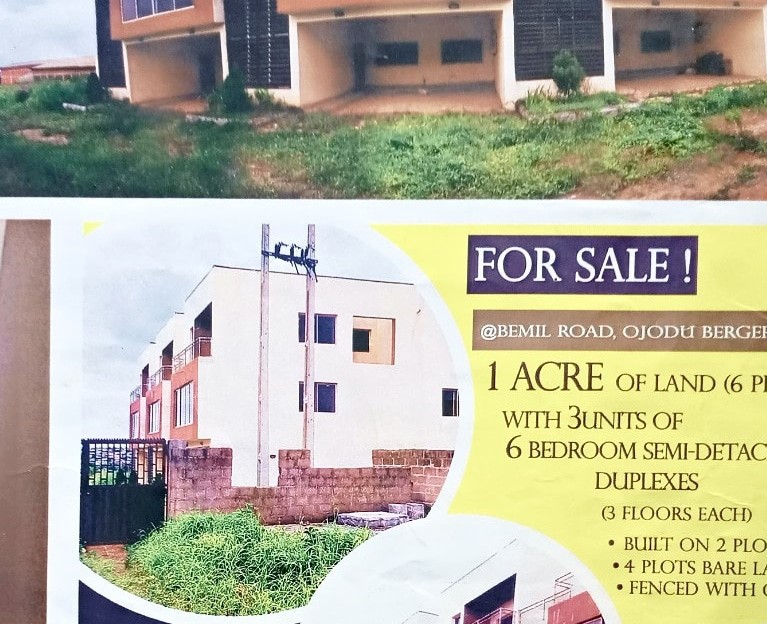 1 acre(6plots) of land with 3units of Senator Standerd 6bedroom duplex(built but not been use) on 2(two) of the plots for sale in a popular Road in Ojodu Berger lagos, suitable a big company, church convention auditorium, big school, mini Estate, Hotel or Big Hospital. call --(Phone number)-- With C of O Price=450MILLION