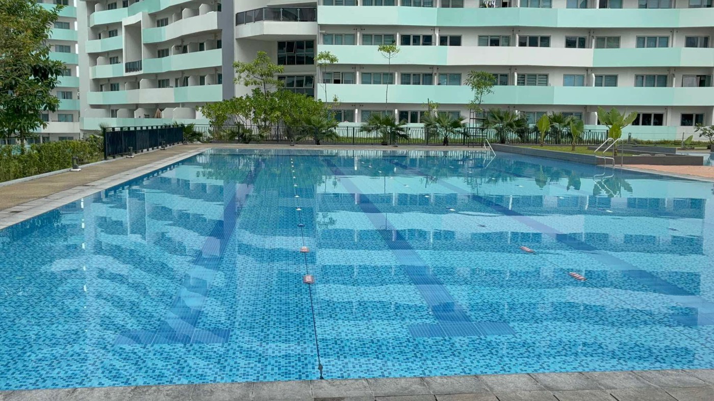 The Residences of Commonwealth QS, prime location 1-bedroom with balcony, 42 sqm. Amenities include swimming pool, kids playground, gym, and music room. Nearby are a college, school, and shopping mall. The building was newly turned over one year ago and features a unique architectural style.