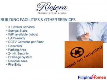 AMENITIES:Lobby; Indoor Gym; Indoor Swimming pool; Sky Lounge; Rooftop Gardens; Outdoor AreaBUILDING FACILITIES:24-Hr Elevators; Service Stairs; Wifi available (lobby); Security Cameras; Cable available; Fire exits; Back-up Power