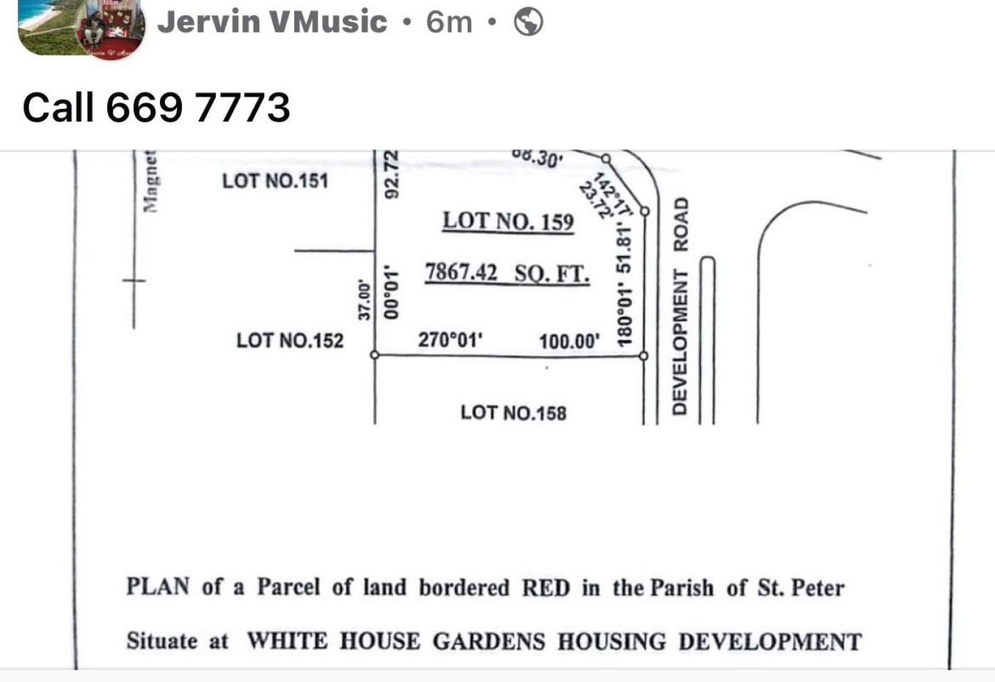Comment: For Sale plot of land in Stapleton with an area of 7867.42 sq ft priced at USD 50,000. The land is a corner piece near White House Garden in St. Peters. Beautiful location.