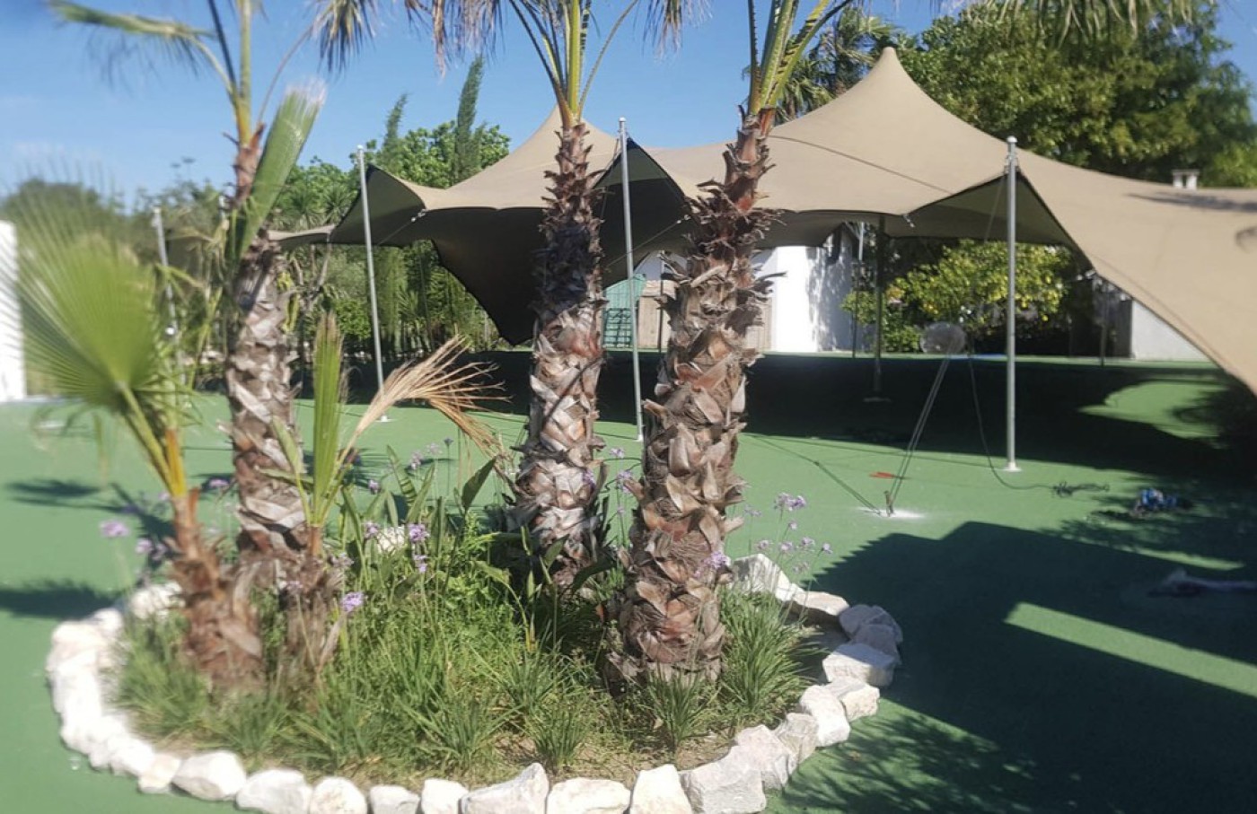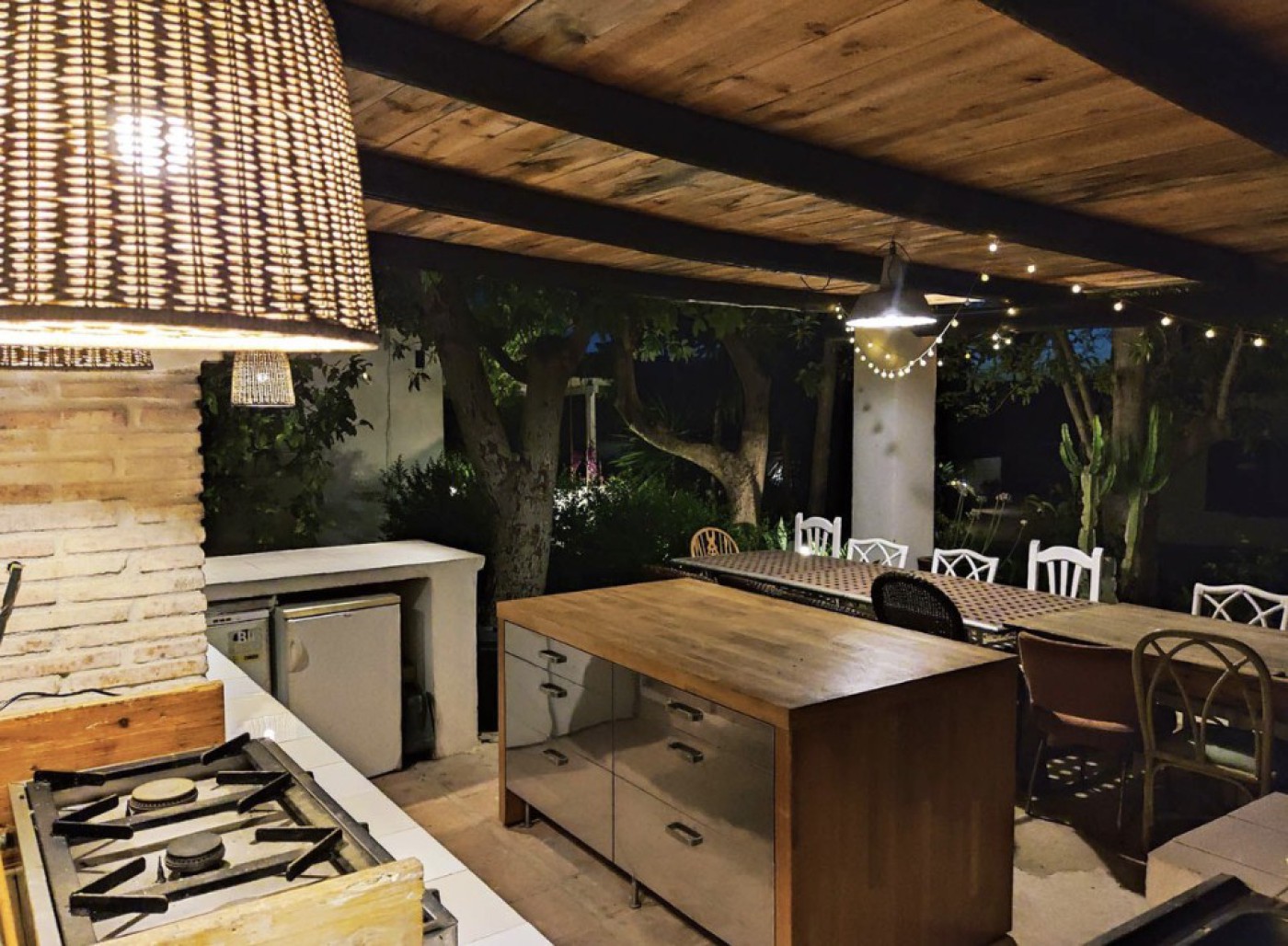 A 40 m² outdoor kitchen is fully equipped with a grill, wood oven, electric oven, and gas stove.
