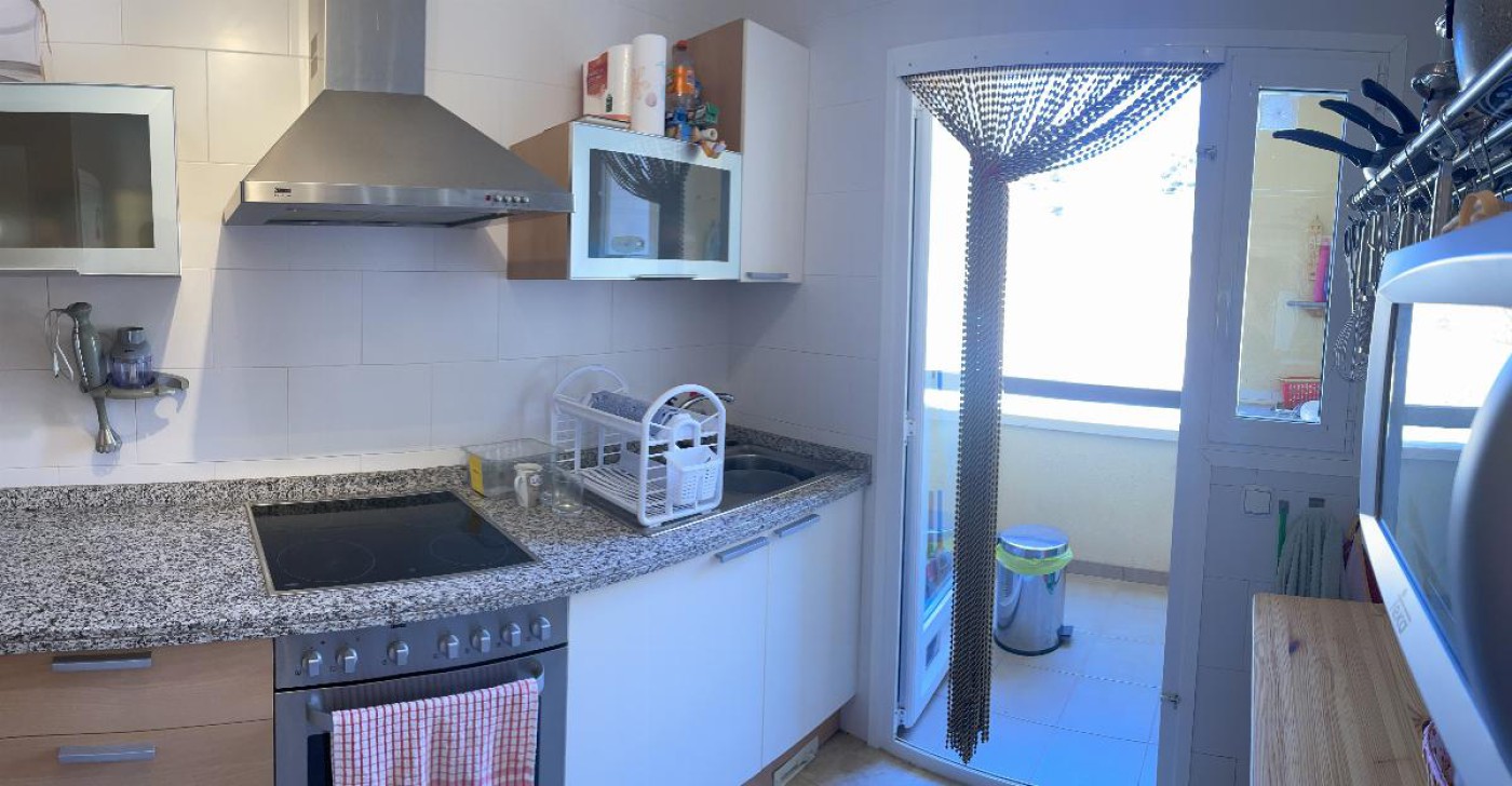 The separate kitchen is fully equipped with the necessary appliances and has practical storage space, as