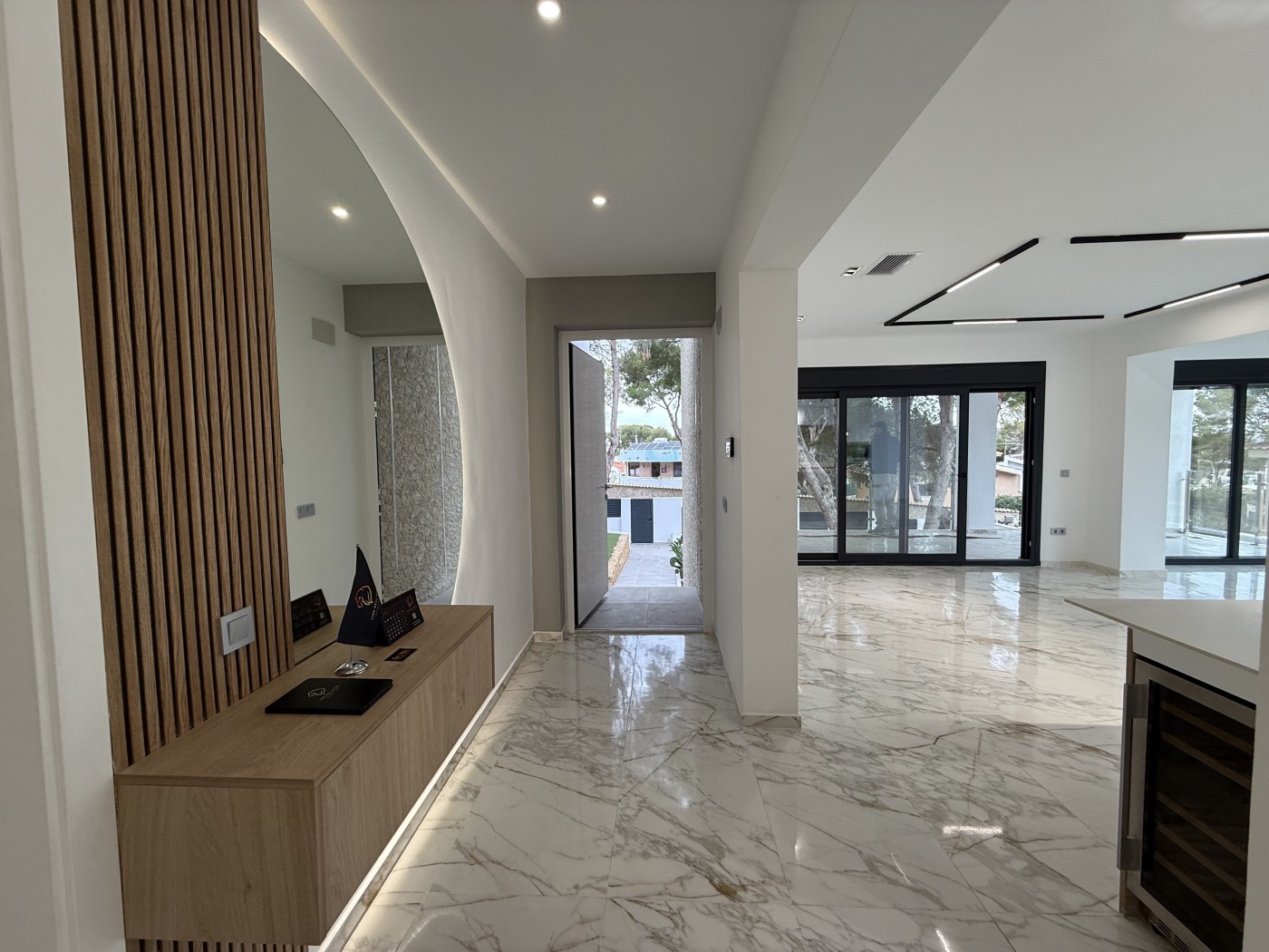 At the heart of the house is a spacious living room connected to an open-