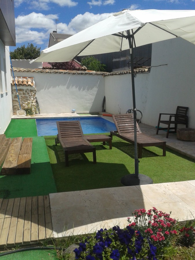 Swimming pool, terrace, barbecue and garden with vegetable garden and native plants.