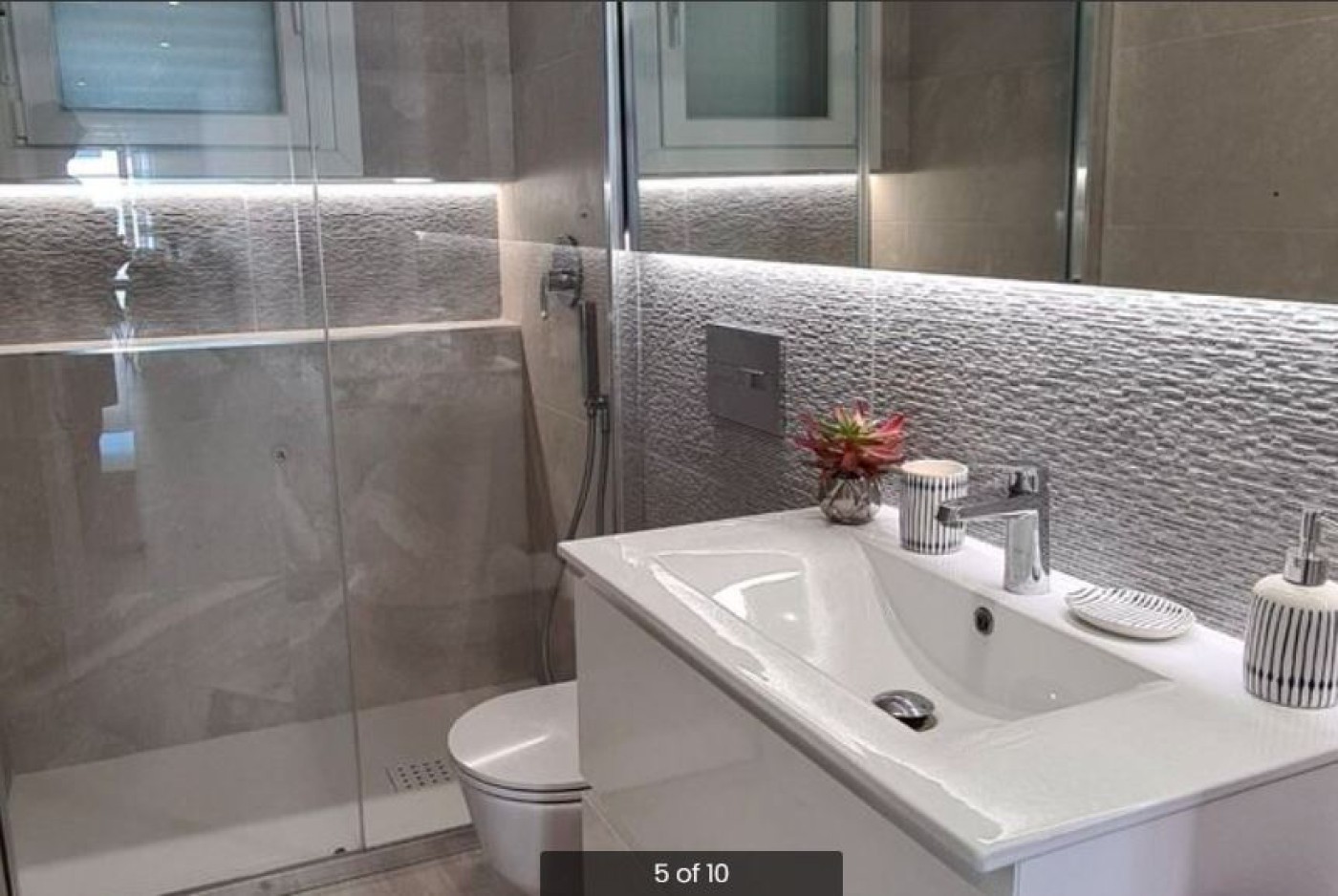 Fully fitted bathrooms with: suspended toilet, vanity unit, mirror, and rainfall shower column.