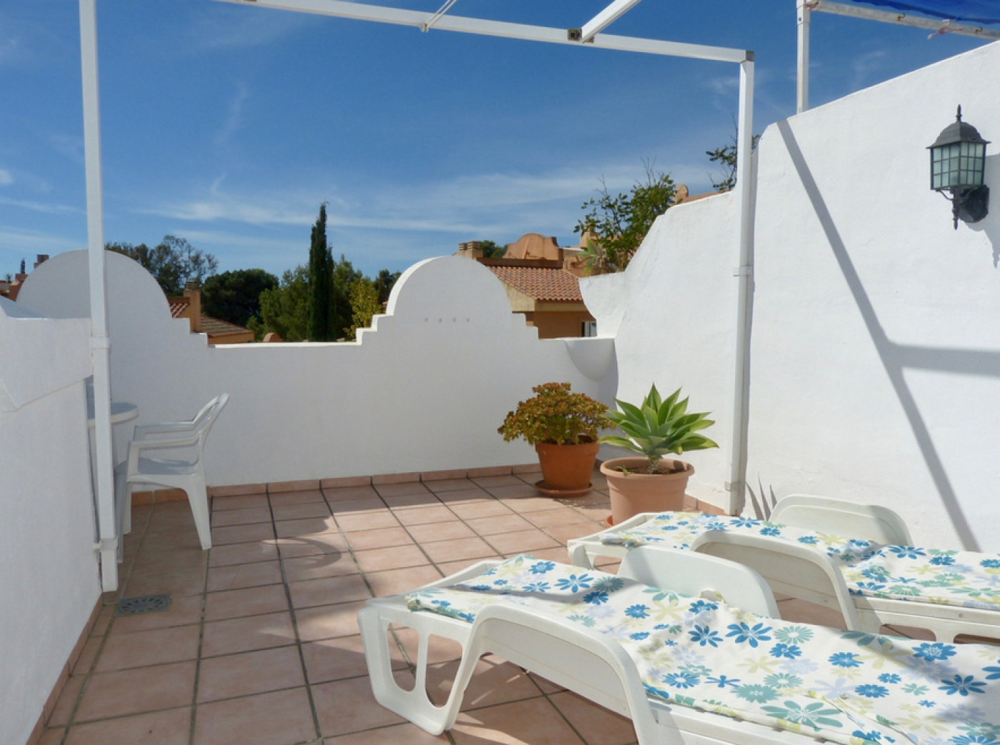 On the first floor, there is a good-sized terrace, a large living room with a fireplace and open equipped kitchen, a toilet, a bedroom with two single beds, a separate laundry room, and a bathroom with a walk-in shower. A staircase leads to the master bedroom, with a large double bedroom, a large dressing room, a private bathroom, and, above all, a very pleasant solarium terrace with beautiful sea and golf views.