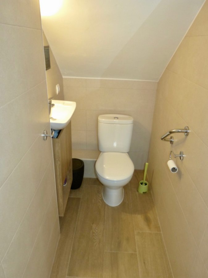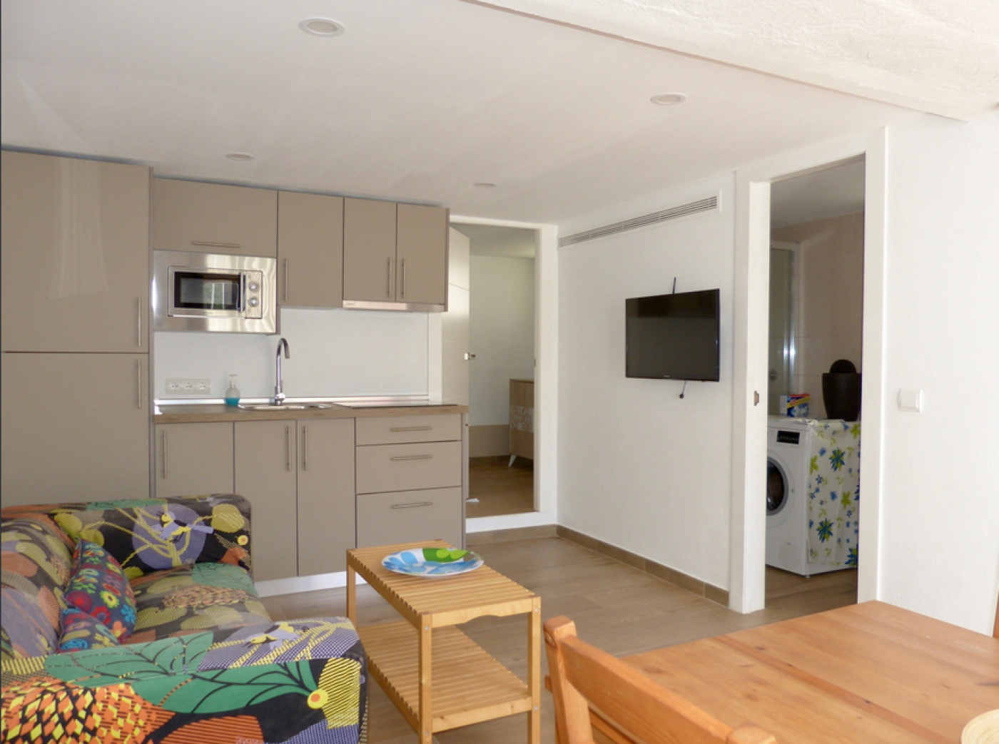 There are two independent apartments, one on the ground floor with a large living room, open kitchen, bathroom, and a bedroom with two single beds. It is a rental property with good income.