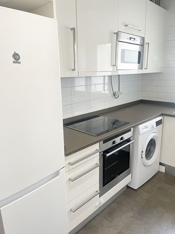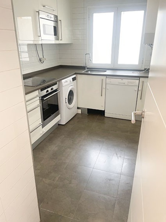 La cocina, completamente equipada con electrodomésticos de alta calidad como lavadora, lavavajillas,