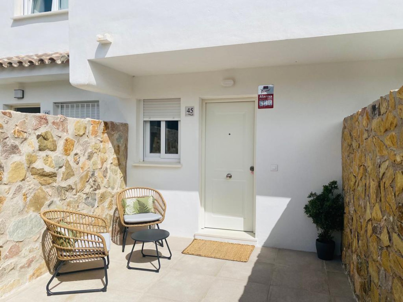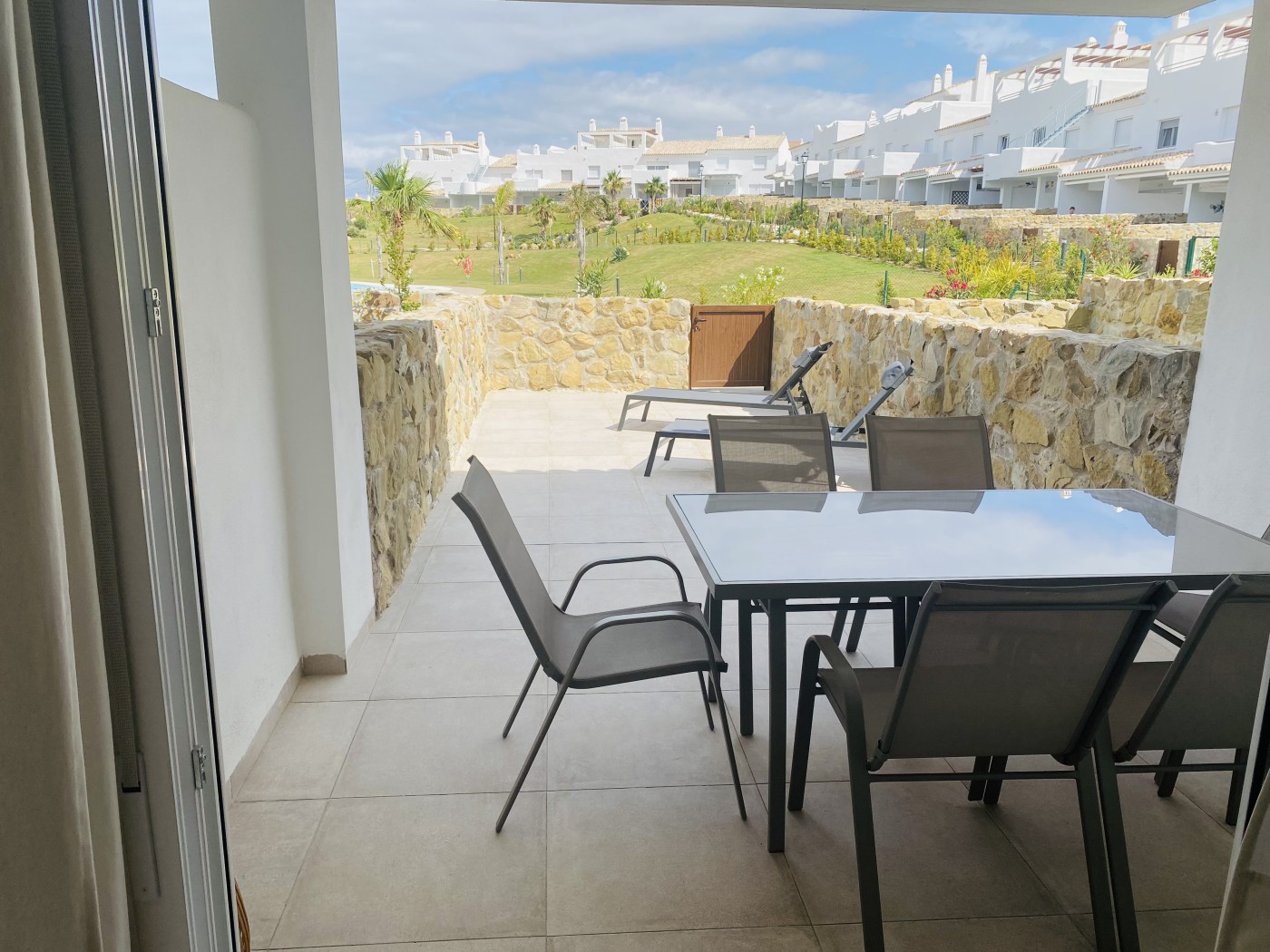 salón con un gran patio trasero privado que, a su vez, es el acceso a las zonas comunes y piscina.