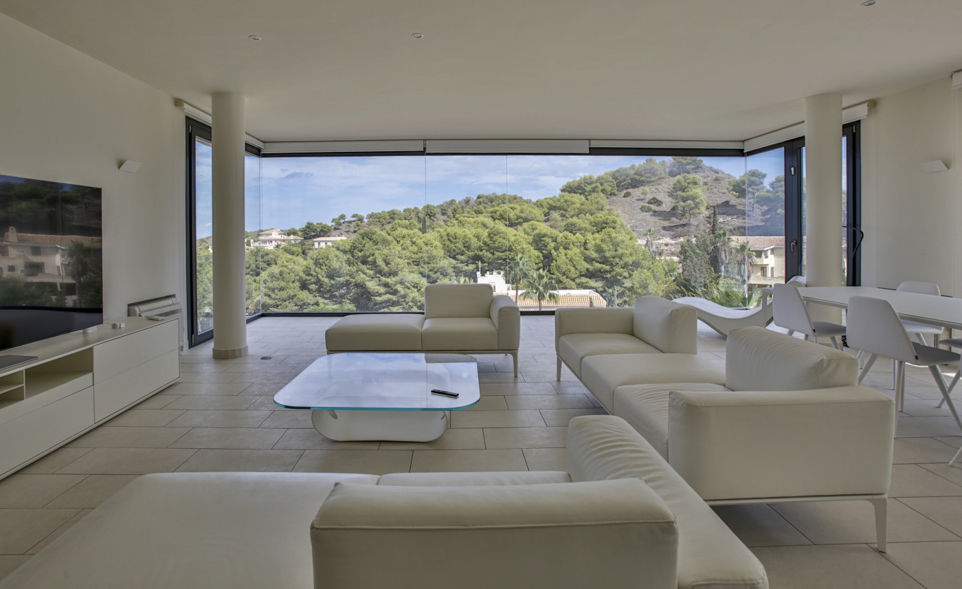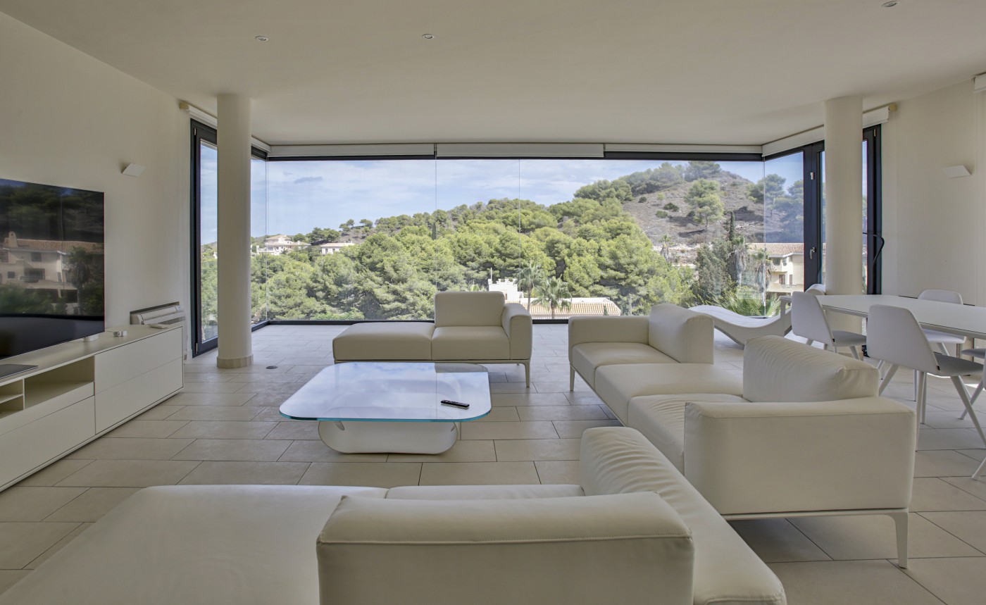 Rodeada de naturaleza y situada junto a un prestigioso campo de golf, esta propiedad combina a la perfección elegancia, diseño contemporáneo y vistas panorámicas únicas al mar y la montaña.