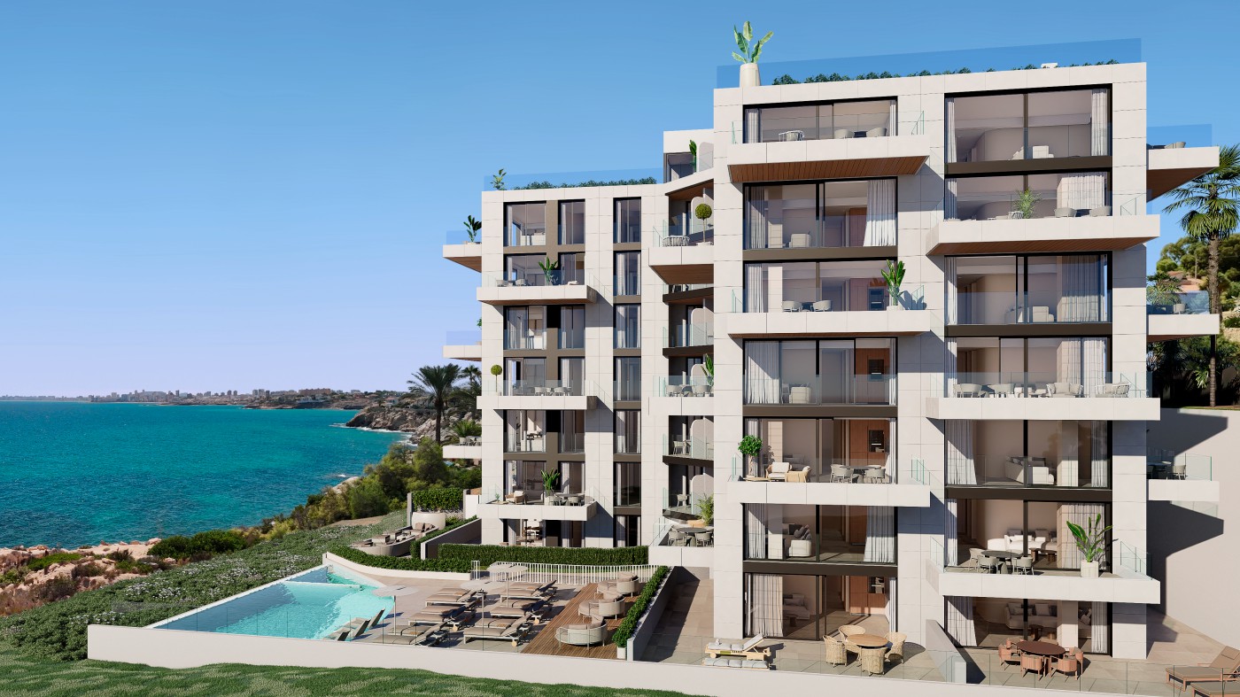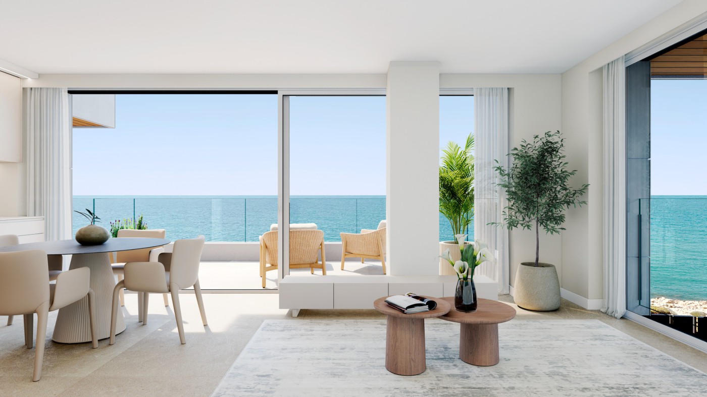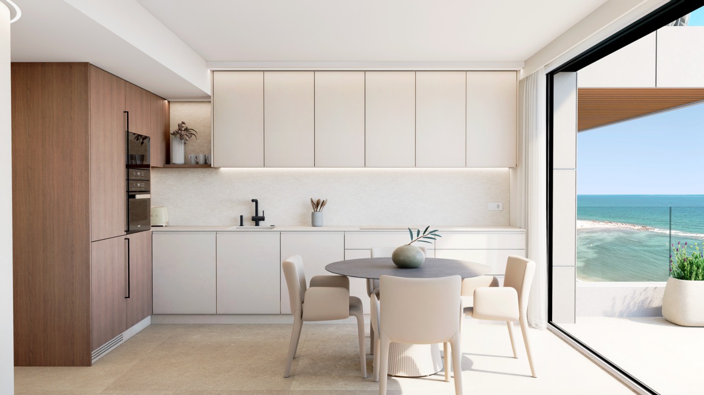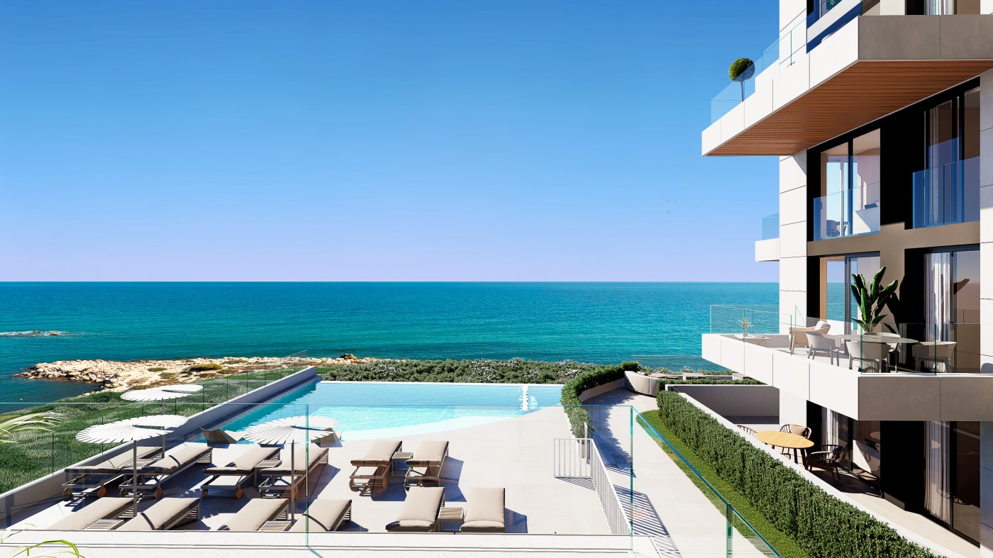 Two-bedroom, two-bathroom apartment in a luxury building with direct views of the Mediterranean Sea. The building comprises 42 exclusive apartments and features extensive private common areas for relaxation and well-being. Amenities include an infinity pool with sea views, a solarium overlooking the Mediterranean, a chill-out area, a fully equipped gym, sauna, outdoor space for yoga and Pilates, a coworking area, bicycle parking, and private vehicle garage. The residence offers direct access to the local beach less than a minute-s walk away. Maria Beach is a luxury residential development located on the Mediterranean coast, 15 minutes from Alicante and 20 minutes from the international airport.