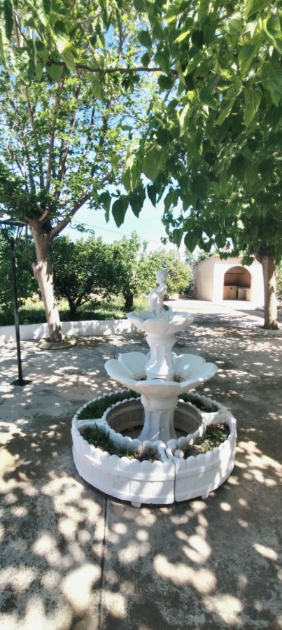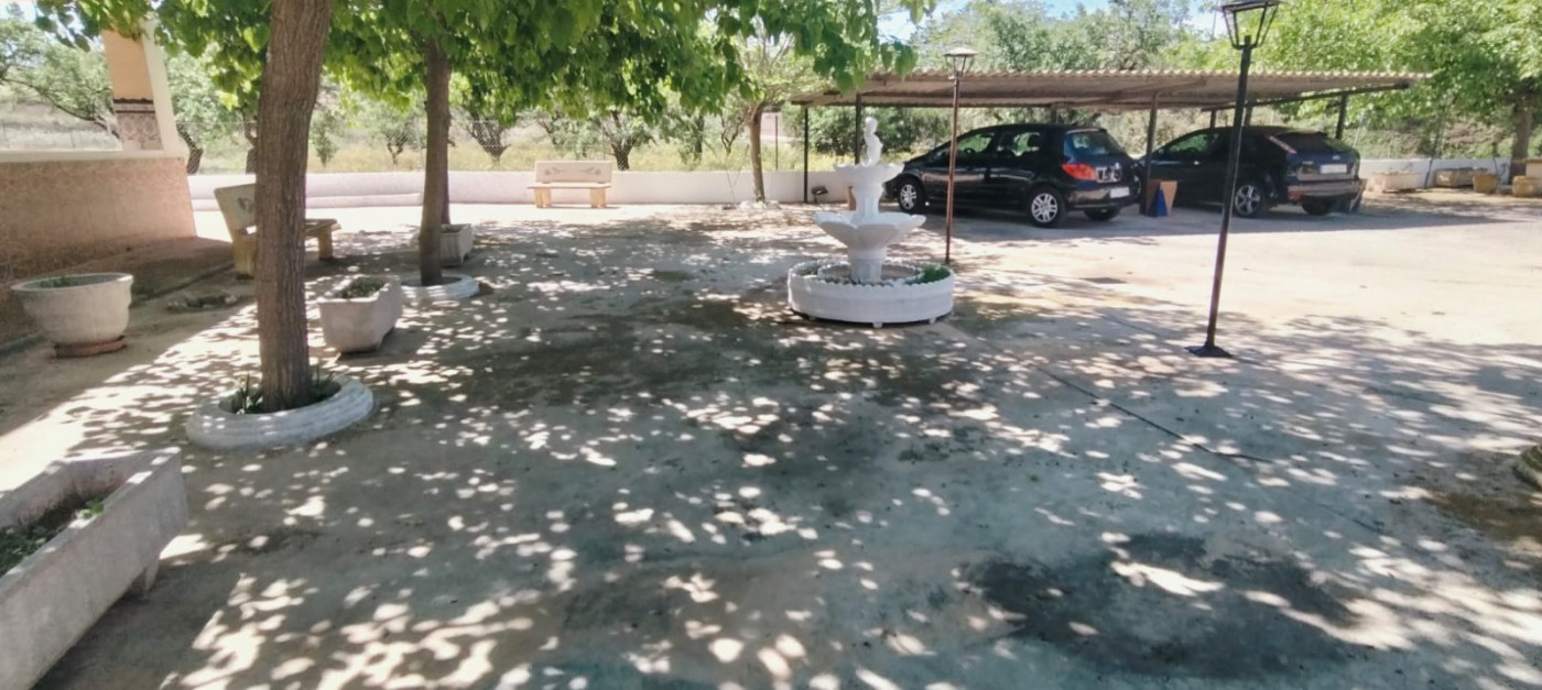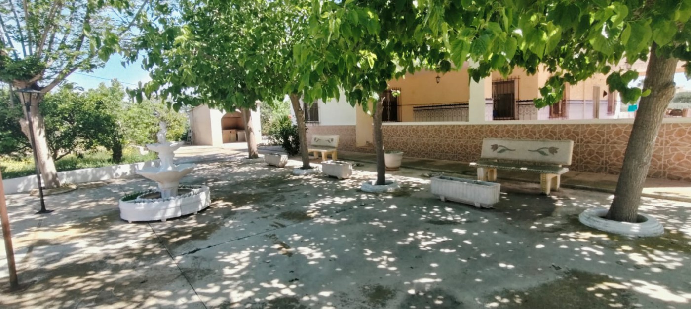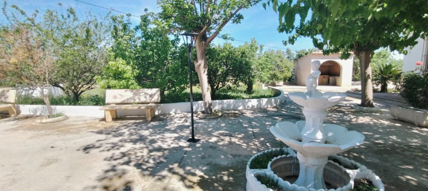 Description: Nestled on a fully fenced 9 tah`ullas plot, this independent chalet offers bright, spacious interiors, including a 25 m^2 kitchen and living room with fireplace. Minimal corridors maximize space. Outside, a 90 m^2 terrace overlooks mature fruit trees, olive and almond groves. With ample storage and parking, it blends tranquility and convenience just 15 km from Elche.