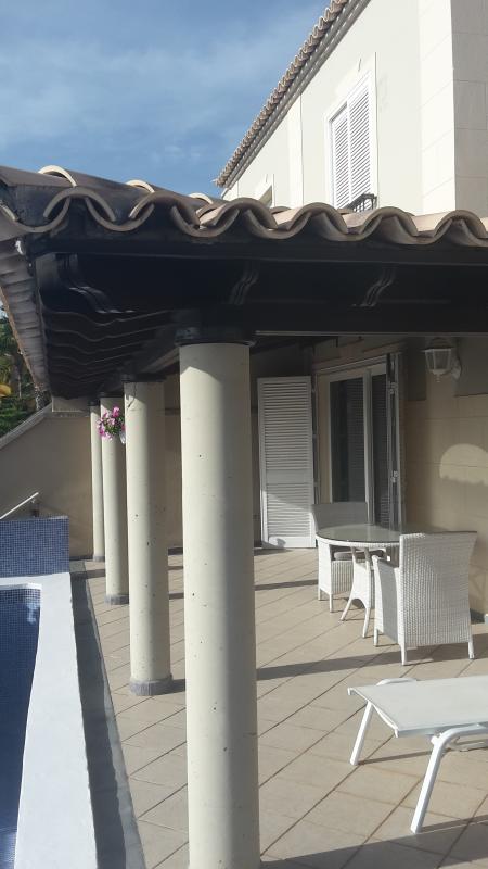 Nearly new beautiful 4 bed, 3 bath semi-detached villa in Chayofa, south Tenerife, 5 minutes to Los Cristianos and Las Americas. Residential area, stunning sea views,plot 300m2, garden with private pool,large launge, separate kitchen and laundry room. Garage for 3 design
