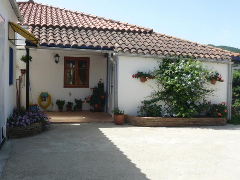Beside the house, separated by a covered 2m x 5m greenhouse/small dog run, is the 48 square meter garage built with concrete block, Spanish Tile roof. The whole garage is plumbed and has good electricity. A strong workbench and shelving take up most of the back wall of the garage. The batteries for the solar system are located here, as well as a top-loading freezer and another gas refrigerator/freezer. Inside the garage is an 8 square meter, fully insulated utility/kennel room. As well as the clothes washer and tumble dryer, there is a large counter with over-sized sink and 2 double-glazed opening windows w/screens. A small doggy door leads to the outside (covered) dog run. There is storage on top of this room.