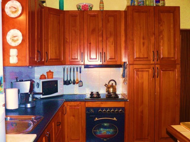 There are 2 kitchens. The inside one is open-plan with a central bar/food preparation unit. Cabinets are varnished wood. The electric refrigerator/freezer will stay, as will the electric oven with gas hob. The `summer` kitchen located on the porch is outfitted with a gas refrigerator/freezer and a gas cooker, as well as large free-standing storage cabinets.