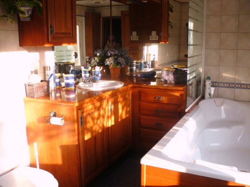 The master bath is very luxuriously fitted with lots of beautiful hand-crafted wood cabinets and tile and mirror walls. The built-in bathtub w/shower is super-sized (1.2m x 2m) and sits under a large picture window which has great views up the Genal river valley. Other furnishings include a toilet and bidet.