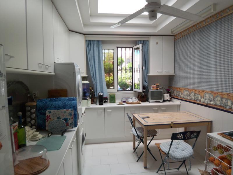 At Street level you find a small hall, a guest toilet, the fully equipped kitchen, a large living room with fireplace and a lovely closed terrace, with split airconditioners, overlooking the golf course.
