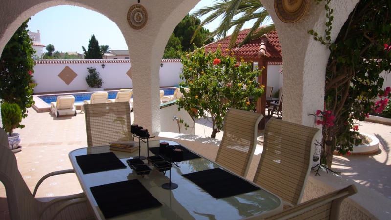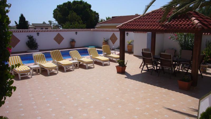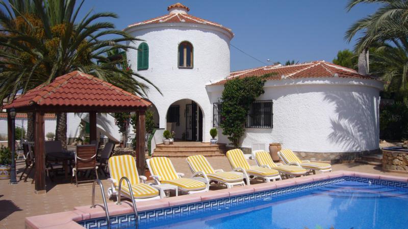 4/5 Double Bedroms, 3 Bathrooms, large lounge kitchen, utility room,pool outside terrace all on one level, two further terraces upstairs with a music studio and private bar, views over the lakes and the Mediterranean, tiled throughout, comes with an outside gazebo fruit trees, manageable gardens, very private set in 900m2 with a build of 220m2