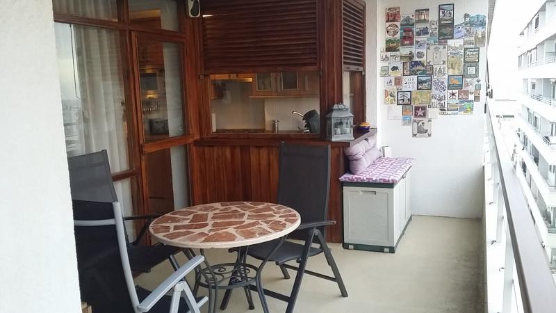 The terrace is equipped with patio heater, is spacious and sunny and faces an opposite apartment, the sea and the old town square of Torremolinos. The terrace is supplied with a table, a side table and four chairs (two deckchairs).