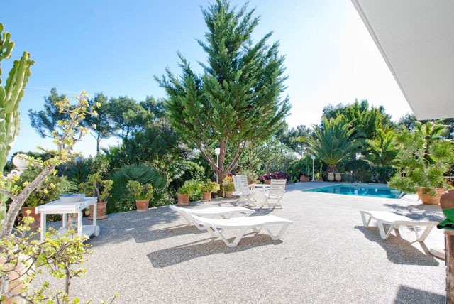 Lovely summer lounge with open fireplace gardens with a large variety of trees palms and cacti large swimming pool and terracing garage and a tiny glimpse of the sea.