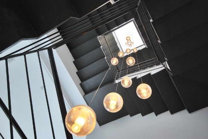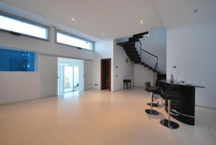 The living area is connected over a staircase down to the pool area and Japanese style garden. The house is equipped with high technology and a security system.